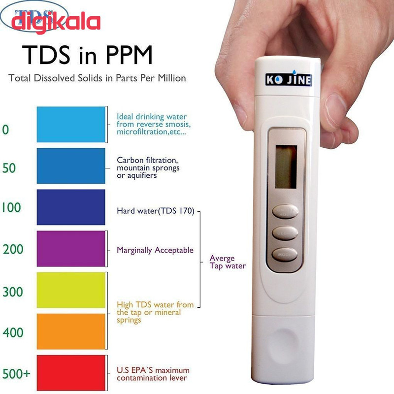 این دستگاه (سختی سنج) با برند معتبر و اورجینال KO JINE جهت اندازه گیری میزان سختی و املاح موجود در آب مورد استفاده قرار می گیرد.TDS Meter مخفف کلمه Total Dissolved solids می باشد.تی دی اس با توجه به میزان مواد جامد محلول در آب و نوع آن (آلی یا غیر آلی) تعیین می شود.مواد معدنی موجود در آب عبارتند از نیترات،نیتریت،آرسنیک،جیوه،سرب،منگنز،روی ،مواد آلی و مواد شیمیایی می باشدکه عنصر کربن در آن وجود داشته باشد.میزان تی دی اس (TDS) آب با کیفیت آب رابطه معکوس دارد.