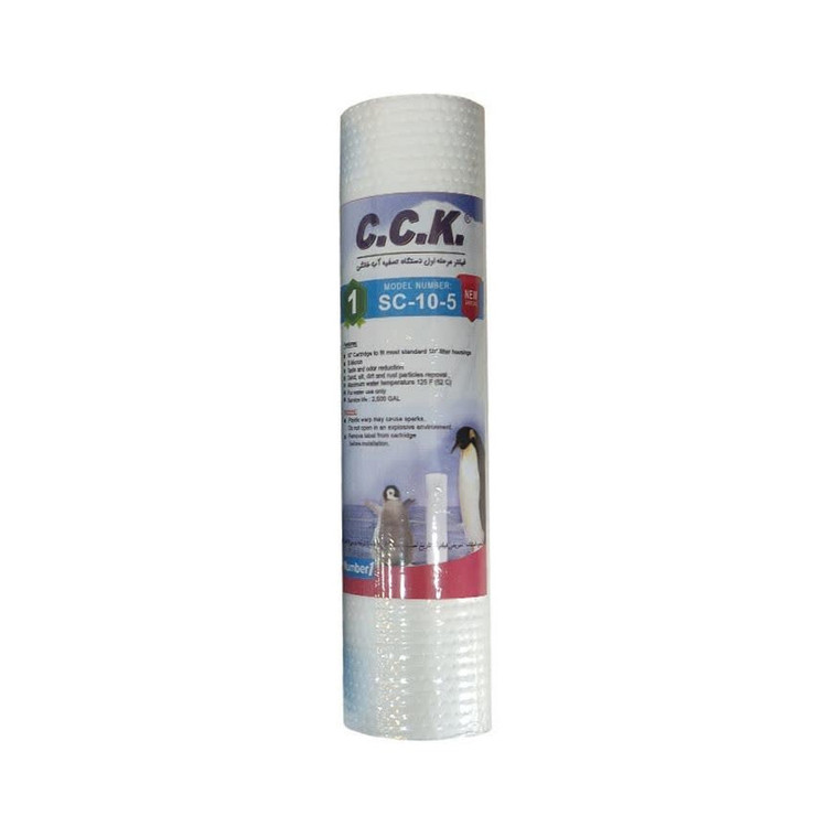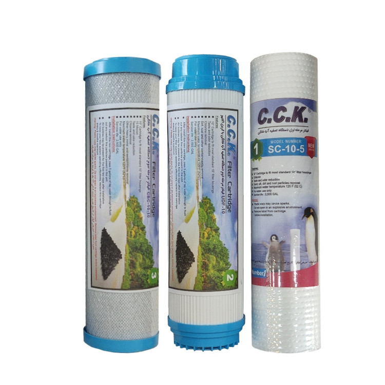 پک فیلتر تصفیه آب سی سی کا شامل فیلترهای مرحله اول، دوم و سوم دستگاه تصفیه آب خانگی است. فیلتر پلی پروپیلن یا فیلتر مرحله اول مناسب برای تمامی دستگاههای تصفیه آب استاندارد موجود در بازار است. فیلتر PP قابلیت حذف ذرات معلق، شن، ماسه و زنگ آب و آلایندههای بیولوژیکی درشت را تا 5 میکرون دارد. عمر مفید این فیلتر، تصفیه 2500 گالن آب است و بعد از آن فیلتر دچار گرفتگی شده و افت فشار در آن افزایش مییابد. در دستگاههای تصفیه آب خانگی با مصرف نرمال حدودا هر 6 ماه یکبار باید فیلتر مرحله اول تعویض گردد. فیلتر کربن فعال پودری یا UDF، همان فیلتر مرحله دوم دستگاه تصفیه آب خانگی است. کربن فعال موجود در این فیلتر رنگ، بو و طعم نامطبوع آب را از بین برده و همچنین گازهای سمی و کلر را به خود جذب میکند. فیلتر مرحله دوم دستگاه تصفیه آب بعد از عبور 2500 گالن آب و یا هر شش ماه یکبار میبایست تعویض گردد. فیلتر کربن فعال بلاک یا CTO، همان فیلتر مرحله سوم دستگاه تصفیه آب خانگی است. کربن فعال موجود در این فیلتر رنگ، بو و طعم نامطبوع آب را از بین برده و همچنین فلزات سنگین مانند آهن ، سرب ، جیوه و آرسنیک و کلر را به خود جذب میکند. همچنین فیلتر CTO بصورت فشرده بوده و توانایی حذف ذرات معلق مانند شن و ماسه و کربن پودری فرار کرده از مرحله دوم را تا 5 میکرون نیز دارد. پک فیلتر سی سی کا تولید شده توسط شرکت جوی واتر جهت تکمیل فرایند پیش تصفیه دستگاه آب شیرین کن مورد استفاده قرار میگیرد. فیلتر مرحله سوم دستگاه تصفیه آب بعد از عبور 2500 گالن آب و یا هر شش ماه یکبار میبایست تعویض گردد.