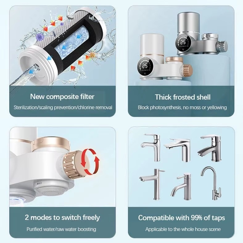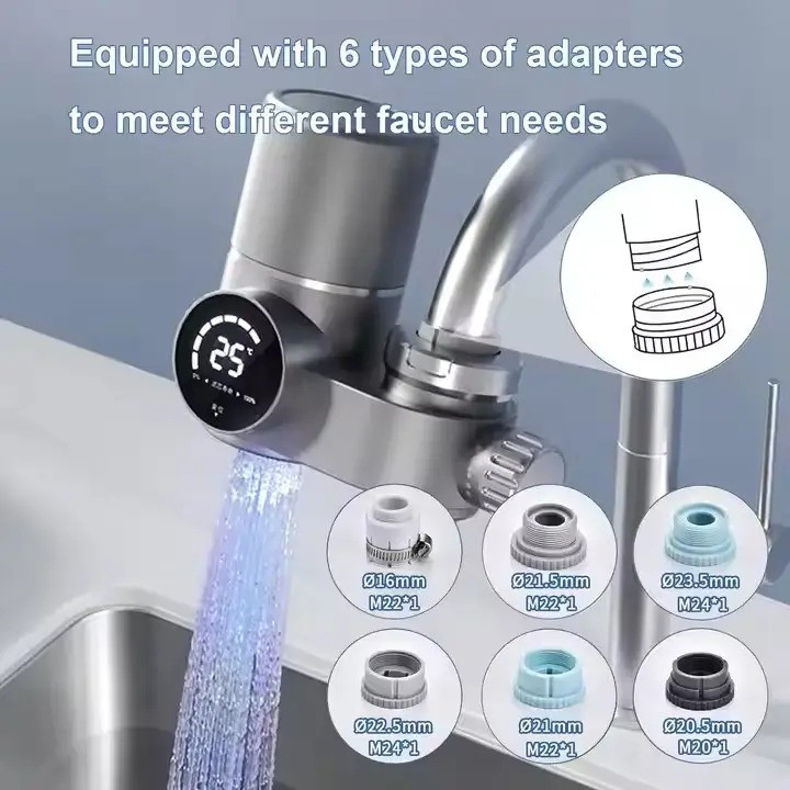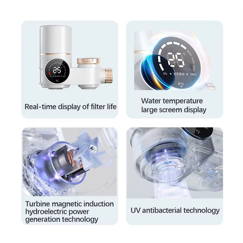 دستگاه تصفیه آب خانگی با دبی 1 لیتر در دقیقه، دارای صفحه نمایش دما و عمر فیلتر، شیر دوحالته و ضدعفونی کننده UV بوده و انرژی آن از چرخش جریان آب تامین میشود(بدون نیاز به باتری). کاربری محصول آسان بوده و روی اکثر شیرآلات بازار قابلیت نصب دارد. جنس بدنه از پلاستیک و وزن کلی آن 350 گرم با ابعاد 8×11×14 سانتیمتر میباشد. فشار آب مورد نیاز آن 0.1 تا 0.4 MPA بوده و جهت ایجاد میکرو حبابهای هوا، سوراخهای خروجی 0.7 میلیمتری ساخته شده است. | دارای فیلتر 7 لایه طراحی شده برای کلرزدایی، املاح زدایی، حذف مواد معلق و ضد موجودات ارگانیک(اِشِریشیا کولی و استافیلوکوک) که به همراه اشعه UV، آب تصفیه شده بی رنگ و بی بو را در اختیار مصرفکننده قرار میدهد. | به همراه محصول، 6 مدل رابط اتصال ارسال میگردد.