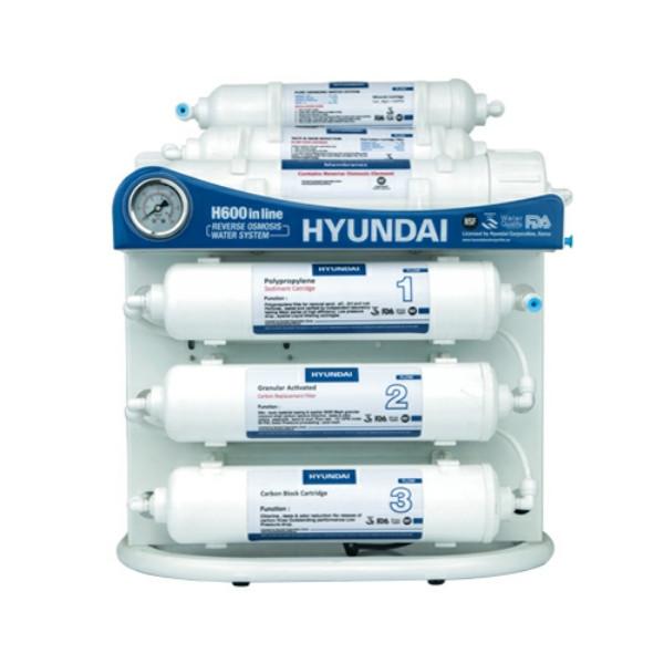 دستگاه تصفیه آب هیوندای تحت لیسانس کره جنوبی مدل H600inline ، توسط فرایند اسمز معکوس (Reverse Osmosis System) ، می تواند هر آبی را به آب تصفیه شده و کاملا بهداشتی مناسب شرب تبدیل کند. قطعات به کار رفته در این دستگاه تایوانی بوده و از بالا ترین استاندارد ها بهره مند است . از قابلیت های این دستگاه می توان حذف شن ، ماسه ، گل و لای ، کلر ، ترکیبات آلی ، رنگ ، بو ، طعم ، نیترات ، نیتریت ، آرسنیک ، کبالت ، جیوه ، سرب ، فلزات سنگین اشاره نمود. یکی از مهمترین نکات در انتخاب یک دستگاه تصفیه آب کارآمد و بهداشتی ، انتخاب دستگاهی است که تمام اجزا و قطعات آن قابل استفاده جهت تولید آب بهداشتی باشد ، اگر قسمتی از اجزا دستگاه تصفیه آب فاقد استاندارد های بهداشتی جهت استفاده انسان نباشد ، این موضوع می تواند باعث اضافه شدن مواد سمی به آب تولید شده توسط دستگاه شود ، بنابراین انتخاب در امر خرید یک دستگاه تصفیه آب استاندارد ، مهمترین گام در بهره مندی از آبی بهداشتی و گوارا است.