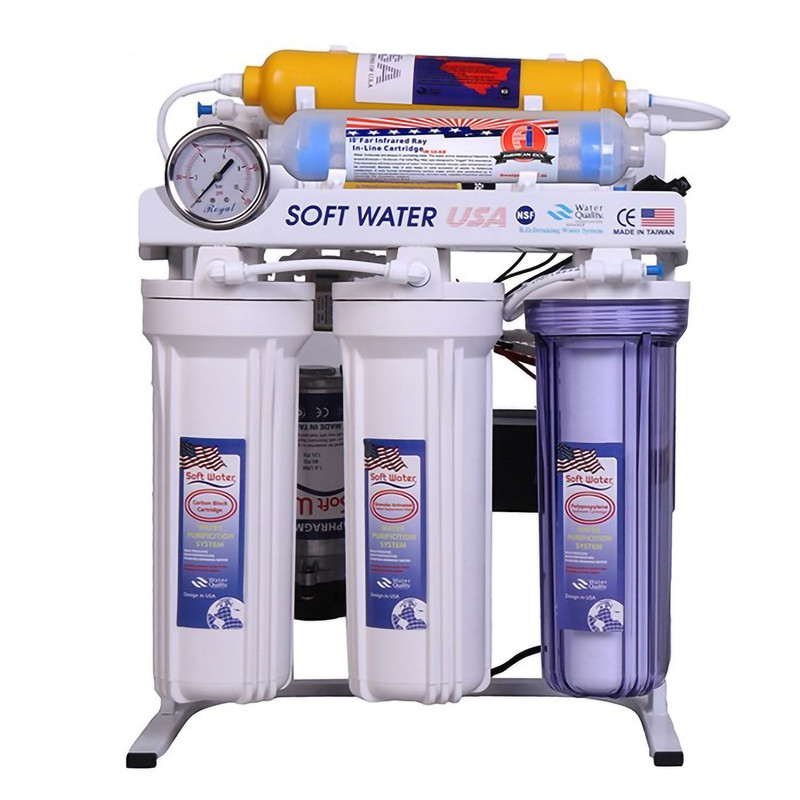 دستگاه تصفیه آب سافت واتر مدلRO-07 با مکانیزم اسمز معکوس (RO) میباشد دارای 7مرحله است.دارای فیلتر الیافی و کربن پودری و کربن جامد و ممبران فیلتر پست کربن و فیلتر مینرال و فیلتر اکسیژن ساز است.قابلیت اضافه کردن فیلتر قلیایی و یووی و...... را دارد.قابلیت حذف شوری آب را دارد.این تصفیه کننده آب یکی از محبوب ترین دستگاه های تصفیه آب است.دارای مخزن آنتی باکتریال و ممبران و شیر برداشت میباشد.