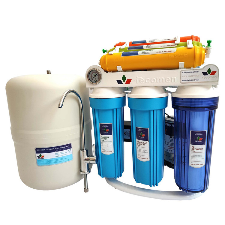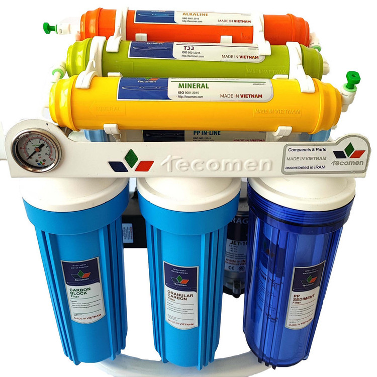 دستگاه تصفیه آب خانگی تکومن با 8 مرحله فیلتراسیون کامل، دستگاهی با قطعات ویتنامی کیفیت بالا میباشد. ترتیب فیلتراسیون تصفیه آب تکومن شامل: مرحله اول فیلتر الیافی (pp) از جنس پلی پروپیلن است. ذرات بزرگتر از 5 میکرون را فیلتر میکند. در نتیجه شن، ماسه، زنگ آب، جلبک، گل و لای از آب حذف میشوند. مرحله دوم (کربن اکتیو) و مرحله سوم (کربن بلاک) کلر، تری هالومتانها، هالو استیک اسیدها، مواد شیمیایی، آفتکشها و حشرهکشها را جذب میکنند. در نتیجه طعم و بوی آب را بهبود میبخشند. فیلتر چهارم (محافظ ممبران) یک فیلتر الیافی 1 میکرون است. اجازه عبور ذرات بزرگتر از 1 میکرون را نمیدهد. در نتیجه باعث افزایش عمر فیلتر ممبران میشود. مرحله پنجم (فیلتر ممبران) اصلیترین فیلتر دستگاه تصفیه آب است. این فیلتر به رو اسمز معکوس اجازه عبور بزرگتر از 0.1 نانومتر را نمیدهد. در نتیجه فلزات سنگین مانند جیوه، آرسنیک، سرب، میکروارگانیسمها شامل ویروس و باکتری و آلایندههای فیزیکی و شیمیایی را حذف میکند. مرحله ششم (فیلتر قلیایی) باعث قلیایی شدن آب آشامیدنی میشود. طبق تحقیقات انجام گرفته آب قلیایی تأثیر مثبتی بر سلامتی فرد دارد. مرحله هفتم (فیلتر پست کربن) طعم و بوی آب را بهبود میدهد. مرحله هشتم (فیلتر مینرال) با اضافه کردن مواد معدنی، هم در تأمین مواد معدنی مورد نیاز بدن تأثیر دارد و هم باعث بهبود طعم آب میشود. علاوه بر 8 مرحله فیلتراسیون، دستگاه دارای قطعات زیر میباشد: پمپ با قدرت 125 psi تایوانی دارد. مخزن 19 لیتری تانک لایف وارداتی فود گرید 3 لایه دارد. اتصالات و هوزینگهای فود گرید محصول شرکتی تکومن دارد. بدنه فلزی ضد زنگ دارد. شیر اهرمی سنگین دارد. پک فیلتر پیش تصفیه اضافی دارد. پک اتصالات نصب به صورت کامل به همراه شلنگ دارد.