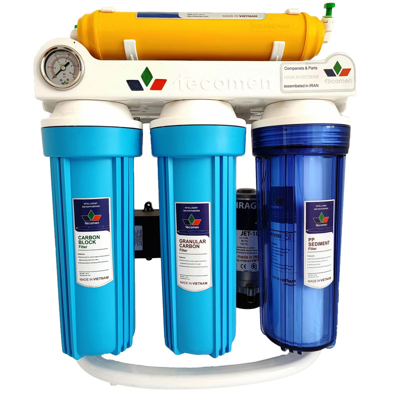 دستگاه تصفیه آب خانگی تکومن با 8 مرحله فیلتراسیون کامل، دستگاهی با قطعات ویتنامی کیفیت بالا میباشد. ترتیب فیلتراسیون تصفیه آب تکومن شامل: مرحله اول فیلتر الیافی (pp) از جنس پلی پروپیلن است. ذرات بزرگتر از 5 میکرون را فیلتر میکند. در نتیجه شن، ماسه، زنگ آب، جلبک، گل و لای از آب حذف میشوند. مرحله دوم (کربن اکتیو) و مرحله سوم (کربن بلاک) کلر، تری هالومتانها، هالو استیک اسیدها، مواد شیمیایی، آفتکشها و حشرهکشها را جذب میکنند. در نتیجه طعم و بوی آب را بهبود میبخشند. فیلتر چهارم (محافظ ممبران) یک فیلتر الیافی 1 میکرون است. اجازه عبور ذرات بزرگتر از 1 میکرون را نمیدهد. در نتیجه باعث افزایش عمر فیلتر ممبران میشود. مرحله پنجم (فیلتر ممبران) اصلیترین فیلتر دستگاه تصفیه آب است. این فیلتر به رو اسمز معکوس اجازه عبور بزرگتر از 0.1 نانومتر را نمیدهد. در نتیجه فلزات سنگین مانند جیوه، آرسنیک، سرب، میکروارگانیسمها شامل ویروس و باکتری و آلایندههای فیزیکی و شیمیایی را حذف میکند. مرحله ششم (فیلتر قلیایی) باعث قلیایی شدن آب آشامیدنی میشود. طبق تحقیقات انجام گرفته آب قلیایی تأثیر مثبتی بر سلامتی فرد دارد. مرحله هفتم (فیلتر پست کربن) طعم و بوی آب را بهبود میدهد. مرحله هشتم (فیلتر مینرال) با اضافه کردن مواد معدنی، هم در تأمین مواد معدنی مورد نیاز بدن تأثیر دارد و هم باعث بهبود طعم آب میشود. علاوه بر 8 مرحله فیلتراسیون، دستگاه دارای قطعات زیر میباشد: پمپ با قدرت 125 psi تایوانی دارد. مخزن 19 لیتری تانک لایف وارداتی فود گرید 3 لایه دارد. اتصالات و هوزینگهای فود گرید محصول شرکتی تکومن دارد. بدنه فلزی ضد زنگ دارد. شیر اهرمی سنگین دارد. پک فیلتر پیش تصفیه اضافی دارد. پک اتصالات نصب به صورت کامل به همراه شلنگ دارد.