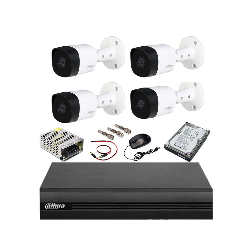 پکیج 4 دوربین داهوا فوق شامل 4 عدد دوربین دیواری پلاستیکی مدل HAC-B1A21P دوربین ها دارای زاویه دید 106درجه و دید در شب بوده و تا 20 متر مربع را در شب پوشش میدهد . یک عدد دستگاه 4 کانال داهوا مدل XVR-1B04 که قابلیت اتصال 4 عدد دوربین HD و 1 عدد دوربین شبکه (IP CAMERA) را دارد. و ساپورت دوربین و ضبط تا کیفیت 2 مگاپیکسل را دارد و علاوه بر ساپورت دوربین های سی وی آر قابلیت اتصال دوربین انالوگ، TVI ،CVI ،AHD را نیز دارد. این دستگاه دارای یک عدد ورودی صدا و یک عدد خروجی صدا، خروجی HDMI ،VGA و AV ، فرمت ضبط H264، قابلیت ضبط حساس به حرکت، پشتیبانی از سرویس انتقال تصویر P2P نیز میباشد . این پکیج دارای 1 عدد هارد 1 ترابایت جهت ذخیره سازی تصاویر، 1 عدد برد صدا جهت ضبط صدا، 1 عدد پاور 12 ولت 10 امپر جهت تغذیه دوربین ها، 50 متر کابل ترکیبی (برق + تصویر)، 8 عدد فیش BNC و 4 عدد فیش اداپتوری نیز میباشد .