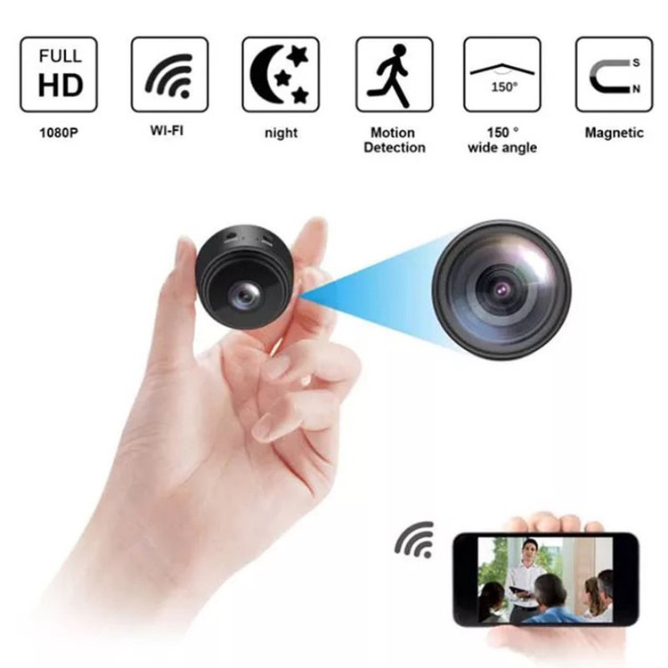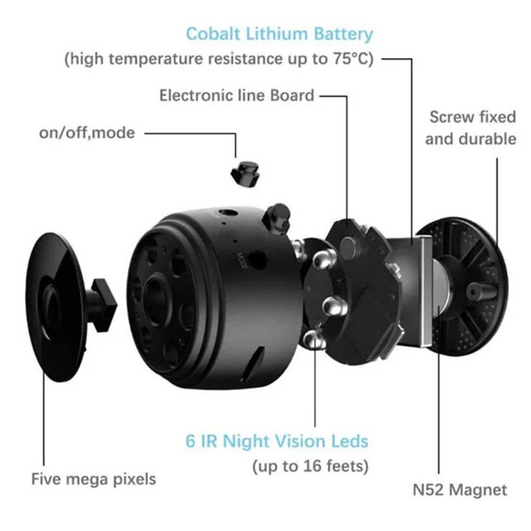 ویژگی تشخیص حرکت از پیشرفتهترین فناوری برای شناسایی افرادی که در داخل دوربین حرکت میکنند و اعلانها را به تلفن شما ارسال می کند. به لطف فناوری دید در شب، می تواند تصویر واقعیت فول اچ دی 1080P را در زمان واقعی در طول روز یا شب تشخیص دهد و آن را مستقیماً به تلفن هوشمند منتقل کند. می توانید از WiFi فقط 2.4 گیگاهرتز Wi-Fi یا بدون WiFi استفاده کنید. اگر وای فای پشتیبانی نمی شود، لطفاً کارت micro SD را وارد کرده و برق را روشن کنید، دوربین فایل ویدیویی را ضبط کرده و آن را روی کارت میکرو SD ذخیره می کند. صفحه فلزی آهنربایی، به شما این امکان را می دهد که دوربین را در هر مکانی بدون پیچ متصل کنید. دوربین وای فای از 6 نور مادون قرمز مخفی F5 با عدم روشنایی و فاصله دید در شب 5M استفاده می کند. تنظیمات هشدار را روشن کنید، پس از تشخیص حرکت، یک اعلان فشار همراه با تصاویر به تلفن شما ارسال می کند. می تواند حدود 60 دقیقه کار کند، همچنین می توانید دوربین را برای ضبط 24 ساعت به شارژر USB وصل کنید. فقط یک کارت Micro SD را در این دوربین مخفی کوچک قرار دهید، آن را روشن کنید و دوربین WiFi مینی میتواند ویدیوی HD را به طور خودکار در کارت Micro SD بدون Wi-Fi ضبط کند. حتی اگر شبکه آفلاین باشد نیز می تواند فیلم ضبط کند. با یک آهنربای قوی داخلی، این دوربین مینی را می توان به شدت روی سطح آهنی دلخواه جذب کرد. با استفاده از پایه مغناطیسی اضافی، می توانید دوربین را در هر مکانی نصب کنید و دوربین را در هر جهتی به صورت دستی تنظیم کنید.