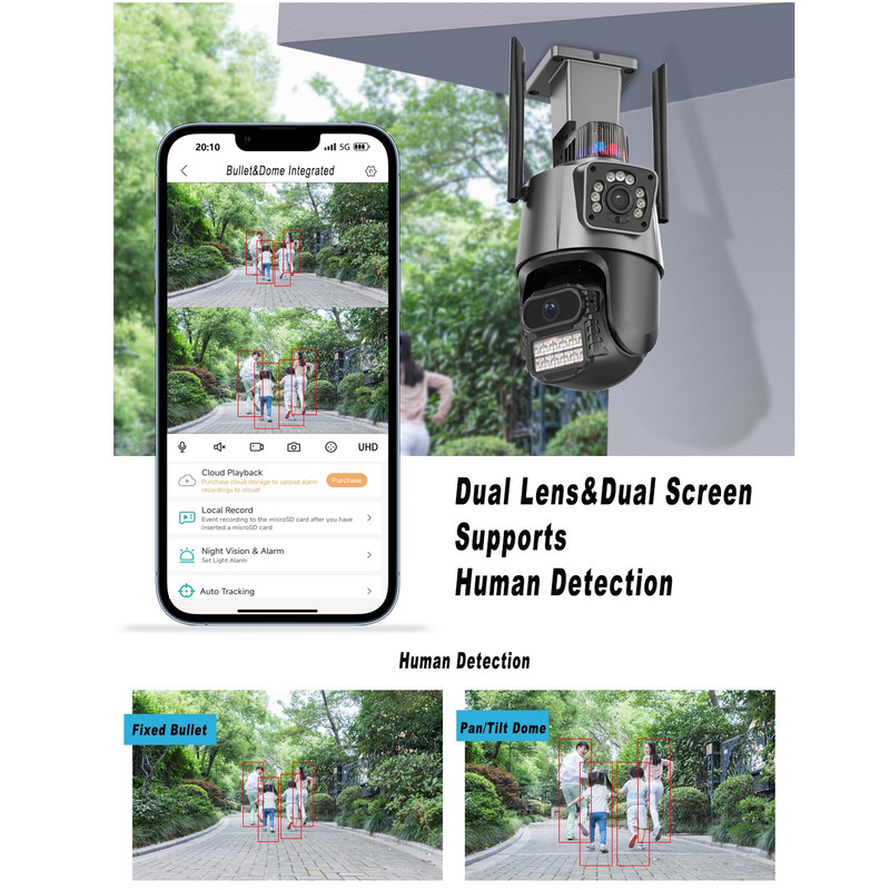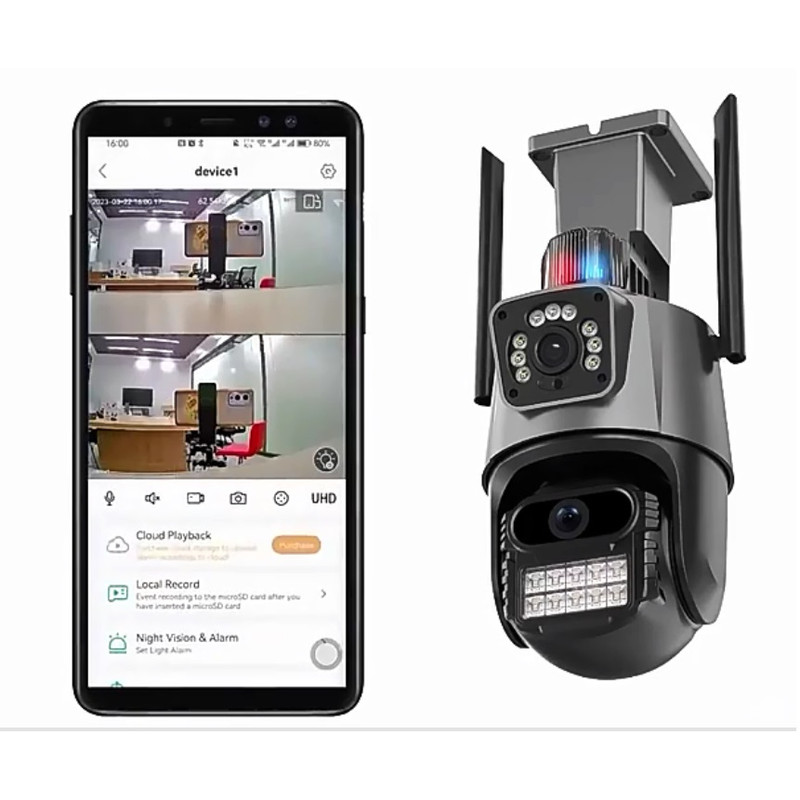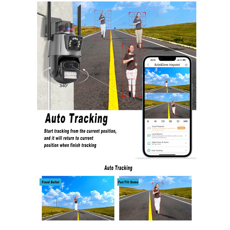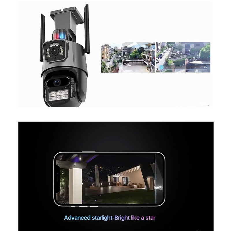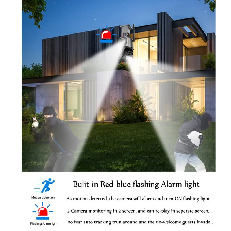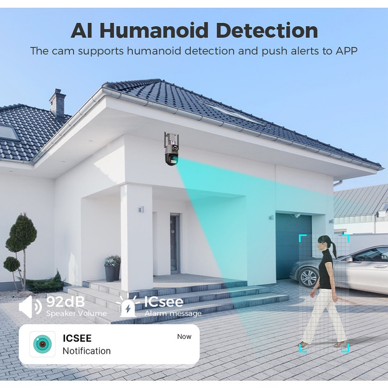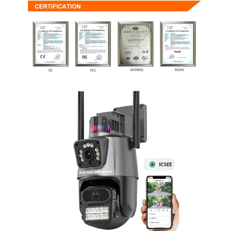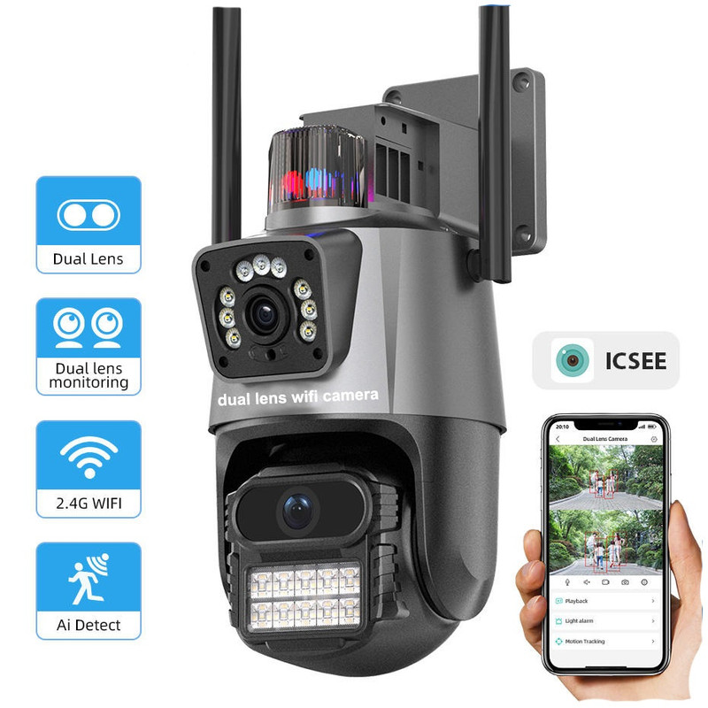 دوربین امنیتی هوشمند با لنز دوگانه بی سیم با ردیابی هوش مصنوعی با 8X زوم 4 و 8 مگاپیکسلی بهمراه وای فای با دو لنز و زنگ هشدار iCSee 2K ، دوربین مدار بسته امنیتی بی سیم دوربین IP PTZ محبوب برای فضای باز و سرپوشیده ، طراحی جدید سیستم امنیتی خانه هوشمند به شمار می رود. از ویژگی های خاص آن : دید در شب، صدای دو طرفه، تشخیص حرکت، تشخیص صدا، ردیابی حرکت انسان، ضد آب / ضد آب و هوا، PAN-TILT، کم مصرف ، با یک لنز ثابت و یک لنز چرخشی، پشتیبانی از مشاهده از راه دور دو نما به طور همزمان ، حرکت: 270 درجه شیب: 90 درجه ، پشتیبانی از پایه های دوربین چند منظوره از انواع روش های نصب دیواری و سقفی ، پشتیبانی از کارت و ذخیره سازی ابری.، مجهز به نورافکن و هشدارهای قرمز و آبی ،قابلیت چرخش 90 Tilt و قابلیت چرخش 340 Pan ،دو لنز و صفحه نمایش دوگانه ، و دارای گواهینامه های کیفیت ROHS - FCC - CE میباشد. تابع : ضد آب / ضد آب و هوا، دید در شب، تنظیم مجدد، میکروفون داخلی، صدای دو طرفه، PAN-TILT را شامل میشود.