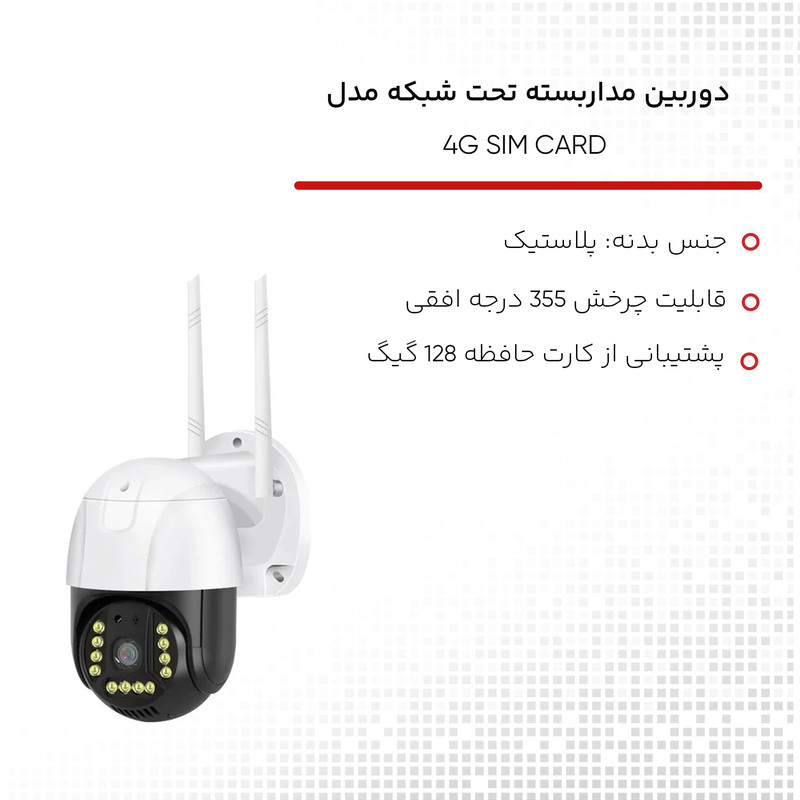 امروزه تامین امنیت محل کار و زندگی از مهم ترین مسائل میباشد.و یکی از مهم ترین مسائل در حوزه امنیت میزان هزینه ی آن نیز میباشد.هدف ما تامین امنیت شما با کمترین هزینه و بهترین بازخورد نیز میباشد.بنابراین با معرفی محصول فوق در این امر به شما کمک خواهیم کرد.دوربین سیم کارت خور نوع جدیدی از دوربین های مداربسته است که جهت مشاهده آنلاین تصاویر نیاز به خرید مودم ندارید،این دوربین مداربسته سیمکارت خور از طریق سیم کارتی که رو دستگاه قرار داده میشود اینترنت مورد نیاز جهت ارسال اطلاعات را تامین میکند.دوربین سیم کارت خور سری جدید از دوربین های مداربسته بدون نیاز به مودم و یا سیم کارت خور است،دوربین سیم کارت خور 4G میتواند درطول روز و شب تصاویر با کیفیت بالایی را ثبت کنید.این دوربین مداربسته نیاز به سیم کشی و دستگاه ضبط نداشته و تنها کافی است تا آن را به پریز برق متصل کنید تا شروع به فیلمبرداری کند.دوربین های مداربسته سیمکارتی با توجه به ابعادی که دارند امکانات بسیار پشرفته ای را نسبت به دوربین های مداربسته معمولی دارند از مزایای شاخص این دوربین ها میتوان به موارد زیر اشاره کرد. نصب و راه اندازی آسان بدون نیاز به نصاب-مشاهده آنلاین تصاویر بدون نیاز به مودم-بدون نیاز به سیم کشی و دستگاه ضبط-قیمت مناسب با توجه به امکاناتی که دارد-ضد آب و گرد غبار IP66 از طریق نرم افزاری که بر روی تلفن همراه نصب میکنید میتوان تصاویر را به صورت آنلاین بدون محدودیت مکانی مشاهده و دوربین سیم کارت خور 4G را کنترل کرد،این دوربین مداربسته سیم کارت خور قابلیت چرخش 350 درجه به صورت افقی و 90 درجه عمودی را دارد و میتوان از طریق تلفن همراه دوربین را جهت ها مختلف چرخانده و زاویه دید مناسب و دلخواه را تنظیم کرد. دوربین سیم کارت خور چرخشی دارای 12 عدد چراغ دید در شب است که از این تعداد، 6 عدد چراغ مادون قرمز است که در تاریکی مطلق میتواند تصاویر با کیفیت را در طول شب تا 30 متر را پوشش دهد. این دوربین دارای 6 عدد چراغ وارم لایت و یا دید در شب رنگی است که به کمک این چراغ ها تصاویر با کیفیتی را در طول شب به صورت رنگی میتواند تا 15 متر ثبت کند.در صورت کم شدن نور محیط به صورت اتومات دید در شب این دوربین هوشمند فعال میگردد. این دوربین سنسور حساس به حرکت دارد و در صورتی که در محل نصب حرکتی را تشخیص دهد.