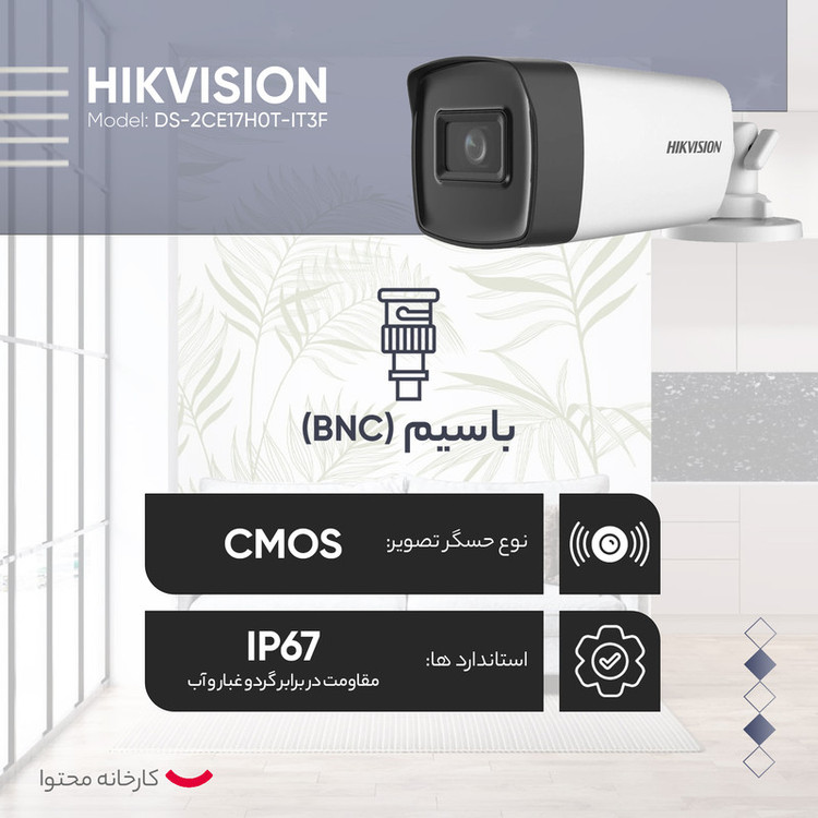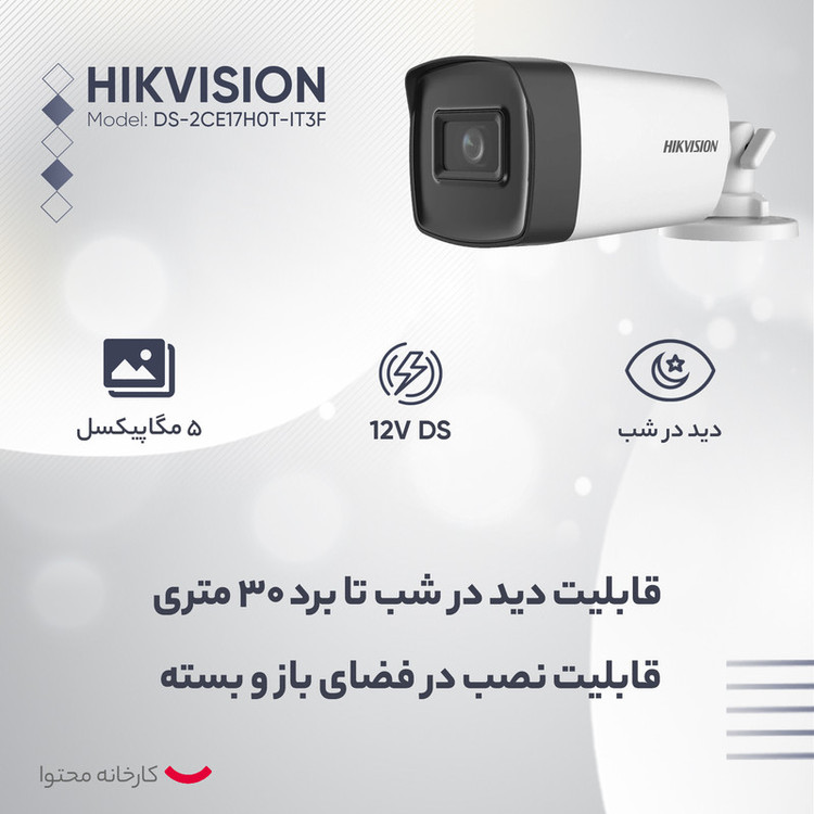 دوربین مداربسته هایک ویژن مدل DS-2CE17H0T-IT3F از نمونه دوربین های هایک ویژن است که به اسم بالت معروف و دارای لنز 2.8 و 3.6 میباشد و جنس این دوربین از فلز است و محصول جدید 2021 این شرکت میباشد و تفاوت این مدل دوربین های 5 مگاپیکسل هایک ویژن در این است که دارای ظاهری جدید و با کیفیت است و برای محیط های داخلی و خارجی قابل استفاده میباشد و از طراحی زیبایی بر خوردار و از نوع 5 مگاپیکسل میباشد و با دستگاه های هایک ویژن همخوانی دارد مثل 7204,7208,7216HQHI-M1 و 7204,7208,7216HUHI-M1 و این دوربین با قابلیت دید در شب 30 متر مربع است و با کمترین نور به حالت رنگی در میاید با حساسیت LUX 0.01 میباشد و در این سری از دوربین ها مصرف برق کمتری دارند و دارای DNR و D-WDR و دارای IP67 میباشد بستن