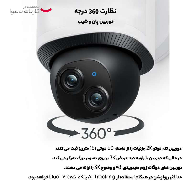 برای مشاهده کامل، 360 درجه به صورت افقی حرکت دهید. هوش مصنوعی افراد را شناسایی می کند و حرکات آنها را ردیابی می کند. گشت زنی خودکار طبق برنامه با نصب کارت microSD (تا 128 گیگابایت) یا اتصال به eufy HomeBase S380، همیشه روشن و همیشه ضبط میکند زمانی که حافظه محلی فعال شده است. فعالیت ها و افراد را می توان همیشه تحت نظر داشت. دوربین تله فوتو 2K جزئیات را از فاصله 50 فوتی (15 متری) ثبت می کند، در حالی که دوربین با زاویه دید عریض 3K بر روی تصویر بزرگ تمرکز می کند. دوربین های دوگانه زوم هیبریدی 8× و وضوح 3K را ارائه می دهند. حداکثر رزولوشن در هنگام استفاده از AI Tracking یا Dual Views 2K خواهد بود. با پشتیبانی کامل از دو باند Wi-Fi 6 از سرعت بیشتر و اتصال قابل اعتماد لذت ببرید. با شبکه های 2.4 گیگاهرتز و 5 گیگاهرتز کار می کند. نور را مطابق برنامه و نیازهای خود سفارشی کنید. آن را برای روشنایی فعال با حرکت یا روشنایی محیط تنظیم کنید. دوربین شما نیز یک چراغ و یک نگهبان است.