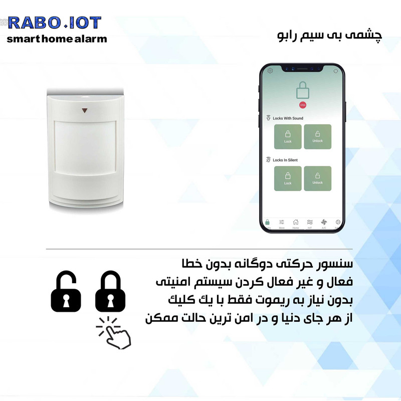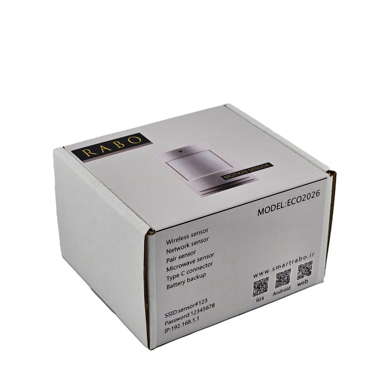 سنسور حرکتی وایرلس رابو دارای رادار و حس گر مادون قرمز به صورت همزمان است و خطای سنسور را به صفر می رساند .اتصال در شبکه ، باتری قابل شارژ و وای فای بودن سنسور از ویژگی های دیگر ان است . توجه کنید این سنسور فقط با دزدگیر های برند رابو هماهنگ است و با هیچ دزدگیر دیگری کار نمیکند .