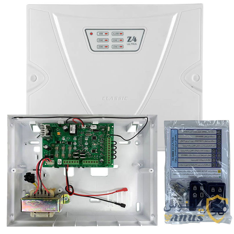 دزدگیر کـلاسیـک +Z4 ULTRA GIGACODE 64 یکی از مدلهای جدید سیستـم هـای حفاظتی اماکن در کشورمی باشد. استفاده از سیستم ریموت کدینگ از مزایای این دزدگیر اماکن می باشد. امکانات پیشـرفتـه دستگـاه و سـادگـی نصب و استفاده از آن، موجب شده تا Z4 منـاسـب حفـاظـت از کلیـه اماکن مسکونی ، اداری ، تجاری ، بانک ها و جواهر فروشی ها باشد. این دستگاه دارای 4 زون (منطقه) می باشد که می توان به آن چشمی با سیم و یا مگنت و انواع سنسور های دزدگیر را به آنها وصل نمود. همچنین این مرکز دزدگیر از چشمی های بی سیم با فرکانس 433.92 مگاهرتز پشتیبانی می شود که پیشنهاد کلاسیک برای این چشمی دزدگیر وایرلس Fox2 می باشد. دزدگیر کلاسیک Z4 به همراه دو عدد ریموت می باشد که می تواند از فاصله حداکثر 100 متری دستگاه را فعال و غیر فعال نمود. این دستگاه را می توان به انواع تلفن کننده های معمولی و یا سیم کارتی کلاسیک و یا سایر برندها متصل کرد. ضمن آن که با اتصال این دزدگیر به تلفن کننده سیم کارت خور G1 قابلیت هایی اضافه می شود که بسیار کاربردی است که مهمترین آن فعال و غیر فعال کردن دزدگیر از راه دور به وسیله تلفن همراه از طریق SMS یا اپ اختصاصی کمپانی کلاسیک می باشد. قابلیت دیگری که می توان از آن نام برد دارا بودن 4 رله جداگانه است که می توان فرمانهای جداگانه ای به دستگاههای برقی محل نصب دزدگیر ارسال کرد. به طور مثال می توان درب برقی دفتر یا محل کار را از راه دور باز نمود.