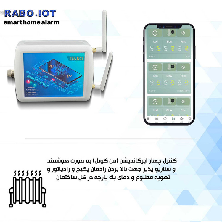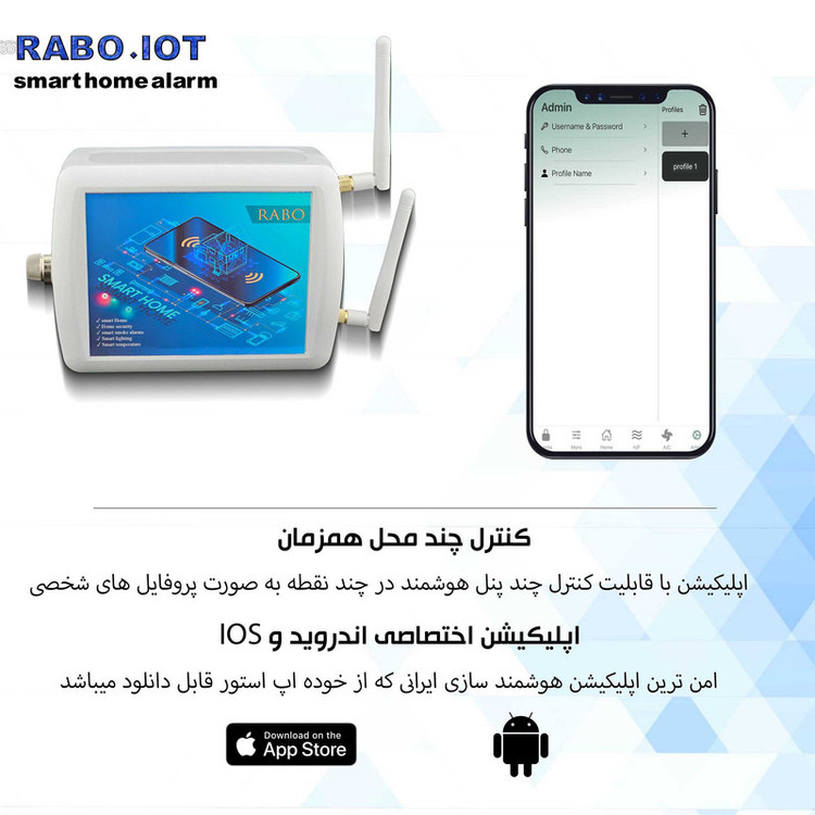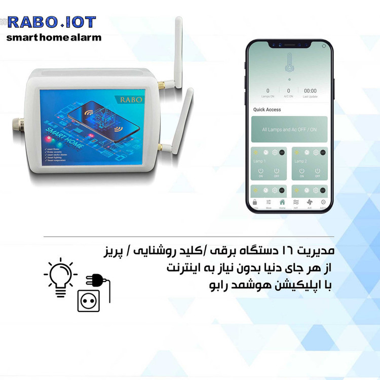دزدگیر هوشمند رابو از نسل جدید سیستم های امنیتی هوشمند برپایه اینترنت اشیاء و بدون نیاز به مودم است . (دارای مودم داخلی ) این سیستم از طریق سیم کارتی که روی ان نصب میشود امکان ارتباط پیامک و تماس جهت ارسال هشدار های امنیتی و همچنین کنترل تجهیزات برقی را فراهم می کند .اپلیکیشن اختصاصی این دستگاه قابلیت نصب و اجرا روی سیستم عامل های اندروید و IOS را دارد (دانلود از خوده APP STORE کاملا امن ) سرور اصلی دارای سنسور دود و گاز است که در زمان نشت گازهای اشتعال زا سناریو هشدار را اجرا میکند . این دستگاه سازگار با تمام سنسور های داخلی بازار است . برخی از قابلیت های دزدگیر رابو : گزارش قطع برق و دارای USP داخلی ، کنترل چند محل همزمان ، امکان اتصال تجیزات بیسیم و باسیم ، قابلیت هوشمند سازی کامل محل ، قابلیت اضافه کردن سنسور دما و منواکسید کربن ، امکان قطع گاز ساختمان هنگام نشت گاز ، روشن و خاموش کردن چراغ و پریز از راه دور بدون نیاز به سیم کشی و یا تعویض کلید و پریز ها ، امکان کنترل ایرکاندیشنر و کولر در مورد سرما و گرمای محیط و دارای آژیر قوی و موثر