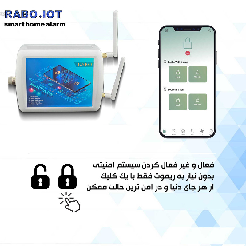 دزدگیر هوشمند رابو از نسل جدید سیستم های امنیتی هوشمند برپایه اینترنت اشیاء و بدون نیاز به مودم است . (دارای مودم داخلی ) این سیستم از طریق سیم کارتی که روی ان نصب میشود امکان ارتباط پیامک و تماس جهت ارسال هشدار های امنیتی و همچنین کنترل تجهیزات برقی را فراهم می کند .اپلیکیشن اختصاصی این دستگاه قابلیت نصب و اجرا روی سیستم عامل های اندروید و IOS را دارد (دانلود از خوده APP STORE کاملا امن ) سرور اصلی دارای سنسور دود و گاز است که در زمان نشت گازهای اشتعال زا سناریو هشدار را اجرا میکند . این دستگاه سازگار با تمام سنسور های داخلی بازار است . برخی از قابلیت های دزدگیر رابو : گزارش قطع برق و دارای USP داخلی ، کنترل چند محل همزمان ، امکان اتصال تجیزات بیسیم و باسیم ، قابلیت هوشمند سازی کامل محل ، قابلیت اضافه کردن سنسور دما و منواکسید کربن ، امکان قطع گاز ساختمان هنگام نشت گاز ، روشن و خاموش کردن چراغ و پریز از راه دور بدون نیاز به سیم کشی و یا تعویض کلید و پریز ها ، امکان کنترل ایرکاندیشنر و کولر در مورد سرما و گرمای محیط و دارای آژیر قوی و موثر