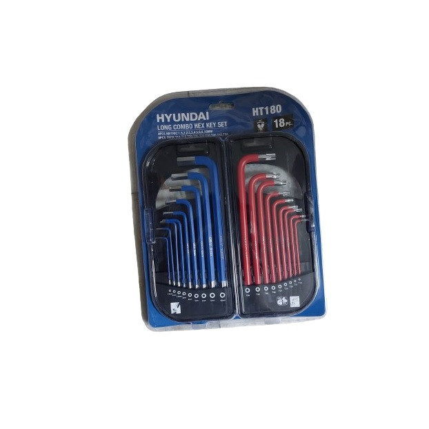 مجموعه آلن شش گوش و ستاره ای فوق بلند هیوندای دارای 9عدد آلن شش گوش ته گرد به شماره های 1.5،2،2.5،3،4،5،6،8،10 میلی متر و 9عدد آلن ستاره ای سوراخ دار به شماره های T10,T15,T20,T25,T27,T30,T40,T45,T50 می باشد.ساخته شده از آلیاژکروم وانادیوم می باشد