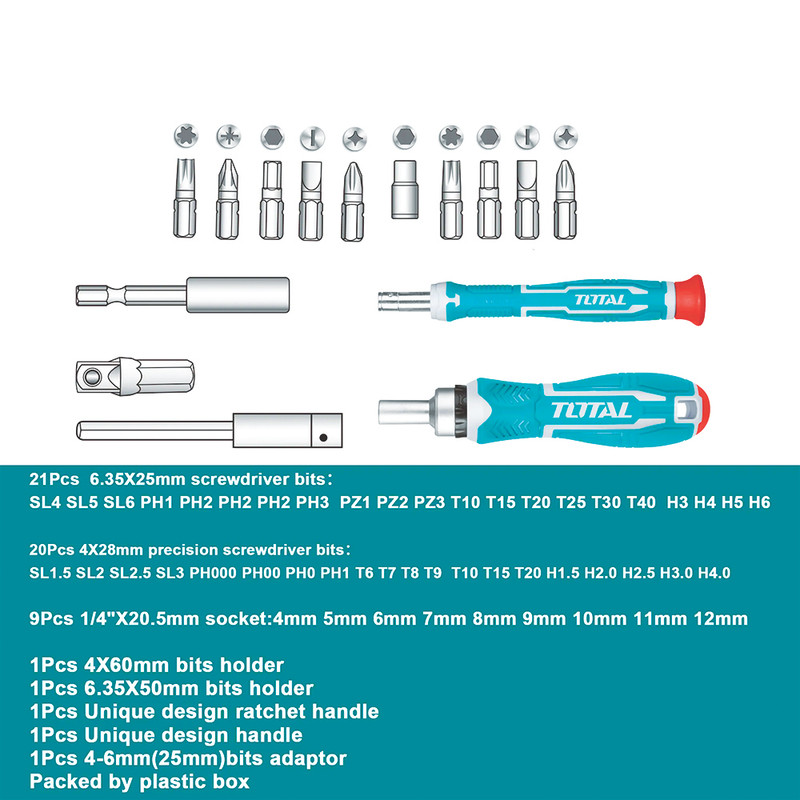 ست پیچ گوشتی و سر پیچ گوشتی 55 عددی توتال مدل TACSD30556 یک ست 55 عددی پیچ گوشتی است که برای انواع پیچ طراحی شده . این ست شامل بیت های دوسو ، چهارسو ، ستاره ای و آلن است و با مکانیزم جغجغه ای خود سرعت کار را افزایش میدهد . دسته ارگونومیک و ضد لغزش آن استفاده طولانی مدت را راحت و ایمن میکند . برند توتال به داشتن محصولاتی با دوام و با کیفیت شناخته میشود که این ست پیچ گوشتی نیز از این قاعده مستثنی نیست . برند توتال یک کمپانی جهانی میباشد که با استفاده از تکنولوژی های روز دنیا و رعایت استانداردهای صنعتی روز دنیا محصولات خود را تحت لیسانس آمریکا در کشور چین تولید کرده و به تمامی کشور های جهان از جمله کشور های اروپایی صادر میکند که به این واسطه دارای استاندارد CE اروپا نیز میباشد . ست پیچ گوشتی و سر پیچ گوشتی جغجغه ای 55 عددی توتال مدل TACSD30556 تحت بررسی کارشناسان فنی ابزار باطن قرار گرفته است و اگر بخواهیم نتیجه این بررسی را به صورت کلی با شما به اشتراک بگذاریم ، این محصول با کیفیت ساخت بالای خود ، طراحی ارگونومیک و دوام بالا ، انتخابی عالی برای کارگاه ها و پروژه های صنعتی و خانگی است . این محصول دارای 21 عدد بیت PH1 . PH2 . PH2 . PH2 . PH3 . SL4 . SL5 . SL6 . HEX3 . HEX4 . HEX5 . HEX6 . PZ1 . PZ2 . PZ3 . T10 . T15 . T20 T25 . T30 . T40 و 20 عدد بیت ساعتی PH000 . PH00 . PH0 . PH1 . SL1.5 . SL2 . SL2.5 . SL3 . HEX1.5 . HEX2 . HEX2.5 . HEX3 . HEX4 . T6 . T7 . T8 . T9 . T10 . T15 . T20 و 9 عدد بیت بکس 4 . 5 . 6 . 7 . 8 . 9 . 10 . 11 . 12 میلیمتر و 1 عدد رابط بیت ساعتی و یک عدد پیچ گوشتی بیت خور ساعتی و یک عدد پیچ گوشتی بیت خور جغجغه ای و 1 عدد رابط سر دریلی و 1 عدد رابط بکس که همراه یک کیف قابل حمل پلاستیک فشرده که تمامی این محصولات را داخل خود جای داده ارسال میشود . شما برای بررسی بیشتر این محصول میتوانید به ابزار باطن مراجعه کنید .