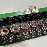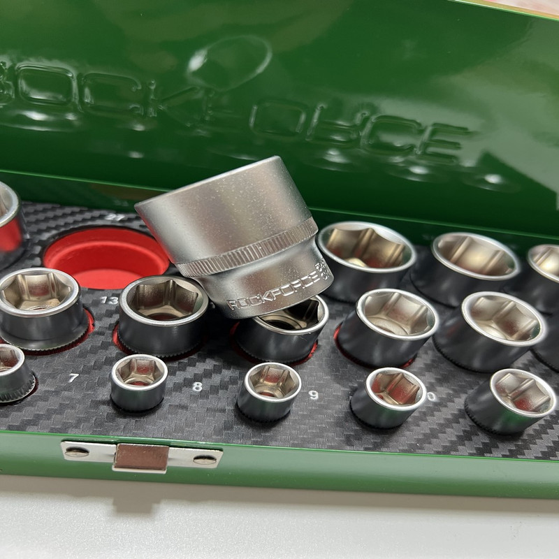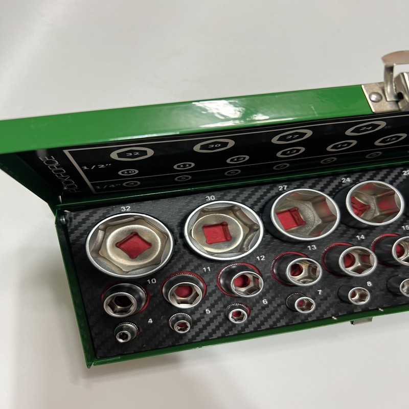 جعبه بکس یک دوم فوق یک مجموعه 25 عددی از بکس های راک فورس تایوان می باشد.این مجموعه دارای بکس های از سایز 4 میلیمتر الی 32 میلیمتر بوده است.بکس های موجود در این مجموعه درایو 1/2 و 1/4 بوده و از کیفیت ساخت بسیار بالای برخوردار است.جعبه فلزی این جعبه بکس بسیار ضخیم و شیک می باشد و داخل بسته بندی عالی می باشد.