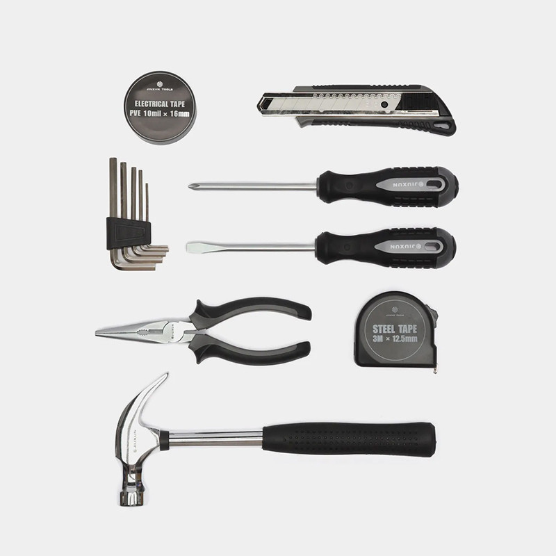 ابعاد جعبه ابزار JIUXUN TOOLS شیائومی 260*180*70 میلی متر میباشد. ابعاد جمع و جور و قطر کم این محصول باعث شده تا این جعبه ابزار در هر گوشه ای از منزل و محل کار یا خودرو شخصی شما براحتی جای بگیرد.جنس جعبه ابزار از پلیمر ABS است که شبیه پلاستیک است اما وزن سبک تر و مقاومت بسیار بالایی در برابر ضربه و فشار دارد و بسیار مستحکم است.همه ابزارالات داخل جعبه JIUXUN TOOLS از فولاد ضدزنگ و با کیفیت ساخته شده اند و کاربردی ترین ابزار هستند.مجموعه ابزار داخل جعبه JIUXUN TOOLS شامل ؛ چکُش ، انبر دم باریک، نوار 3 متری ، 5 عدد آچار آلن ، پیچ گوشتی دو سو ، پیچ گوشتی چهارسو ، تیغ کاتر ، و چسب برق میباشد. ضمناً وزن این جعبه ابزار با محتویات داخلش 1 کیلوگرم است.این مجموعه با احتساب کیف مجموعه 10 عددی میباشد.