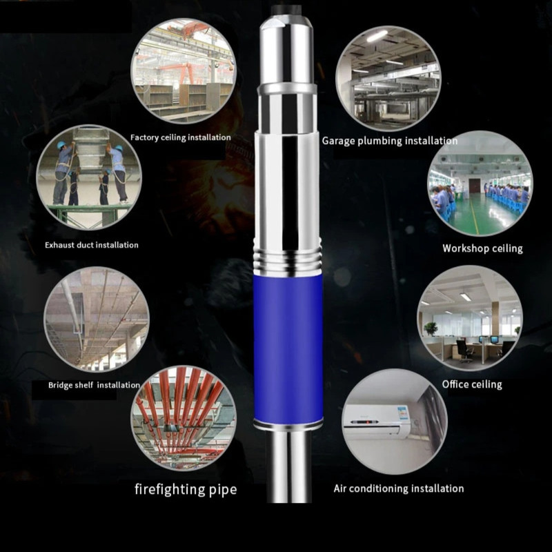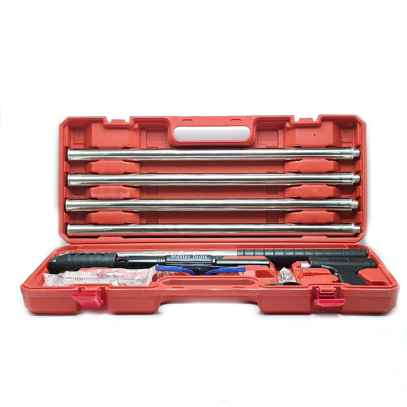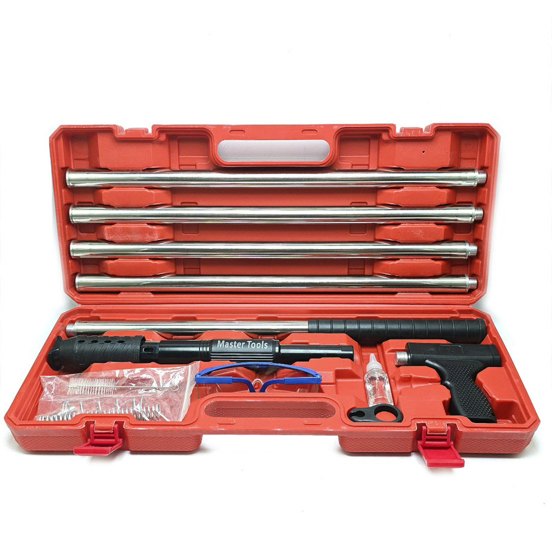 میخکوب دستی ( فشاری ) چاشنی سرخود مستر تولز با ارتفاع 3.2 متر : میخکوب فوق دارای 5 عدد لوله اتصال جهت بالا بردن ارتفاع تا 3.2 متر معادل 320 سانتی متر تشکیل شده است که می توانید از ارتفاع 50 سانتی متر تا 320 سانتیمتر طول آن را عوض کنید. این میخکوب جهت فرو کردن میخ به انواع مصالح همچون آهن ،سیمان و بتن ، سنگ ، چوب و ... ساخته شده است که به راحتی یک فشار این عمل اتفاق می افتد به همراه این دستگاه تعداد 50 عدد میخ 6.5 سانتی مخصوص همین دستگاه موجود می باشد که در صورت نیاز بیشتر به میخ می توانید از طریق همین فروشگاه اقدام فرمایید .در نظر داشته باشید . باید میخ 6.5 سانت تهیه فرمایید.به همراه این دستگاه جند قطعه یدکی همچون فنر و سوزن و نیز روغن دان جهت روغنکاری و نیز فرچه و عینک قرار دارد.