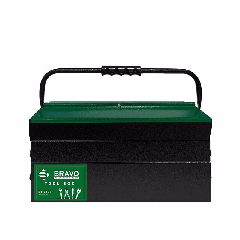 این محصول جعبه ابزار فلزی 40 سانت 3 طبقه براوو می باشد. این محصول از ورق فولادی ضخیم و مقاوم و همچنین ضد زنگ ساخته شده است. برای مقاومت بالای محصول در برابر خط و خش و همچنین زیبایی جعبه ابزار از رنگ چرمی الکترو استاتیک کوره ای بعنوان روکش ورق فولادی بدنه استفاده شده است. همچنین در اتصالات طبقات جعبه و درب و دسته جعبه ابزار پرچ های فولادی به کار برده شده است تا مقاومت بالایی برایی جابجایی جعبه و باز و بست نمودن آن داشته باشد. طراحی جعبه ابزار فلزی براوو کاملا مهندسی شده و دارای کارایی بالا نسبت به فضای آن می باشد. در قسمت وسط دسته از یک دستگیره پلاستیکی از جنس ABS با طراحی ارگونومیک جهت حمل آسان استفاده شده است.