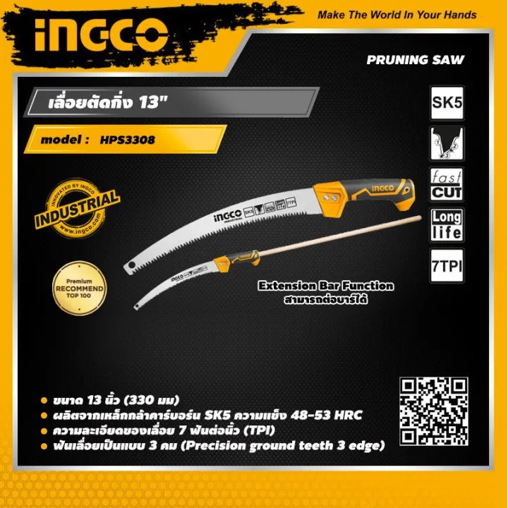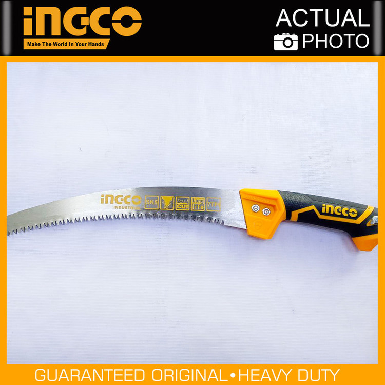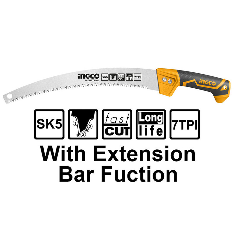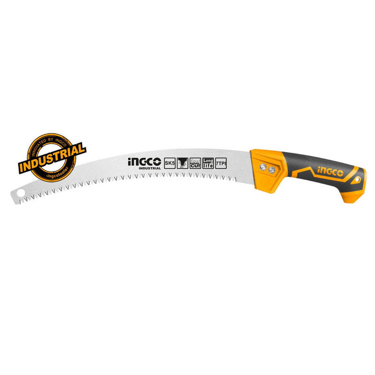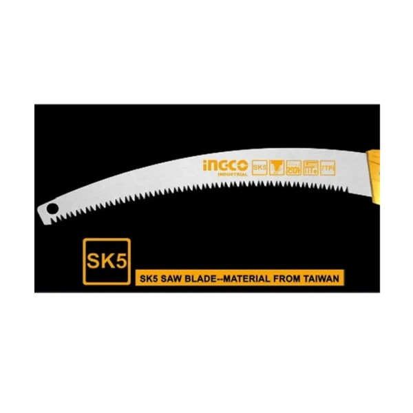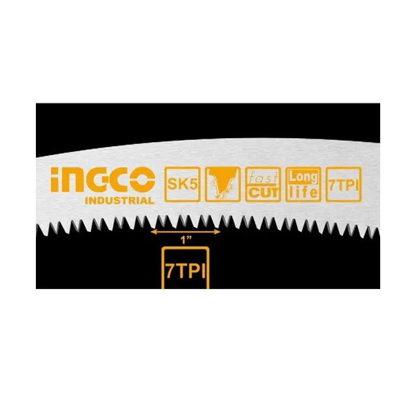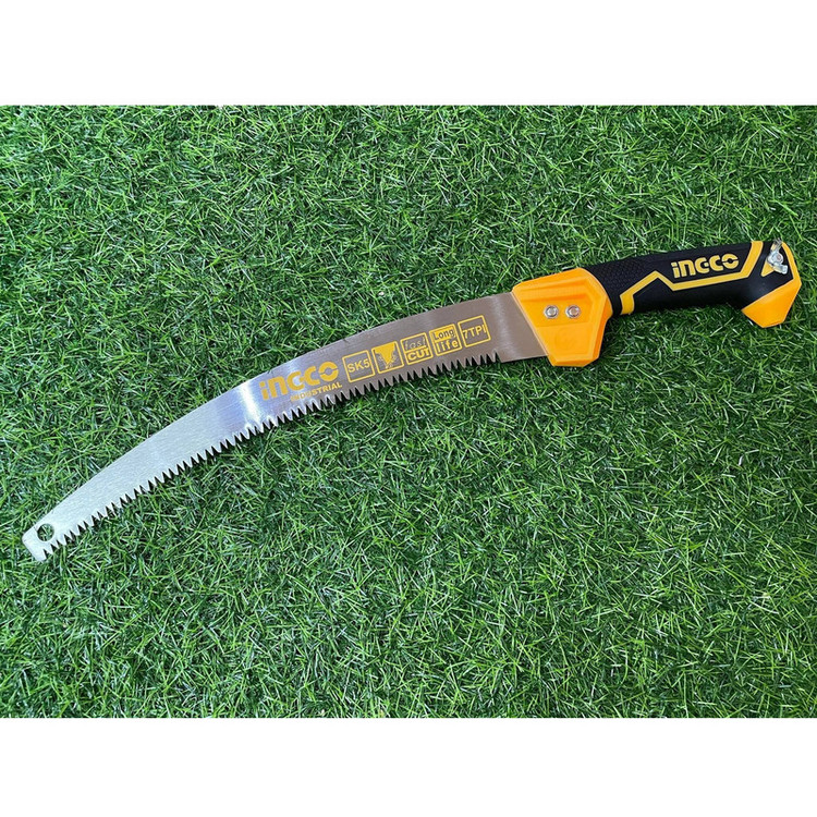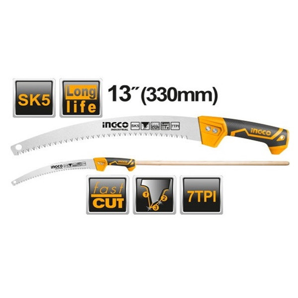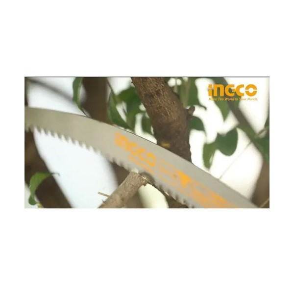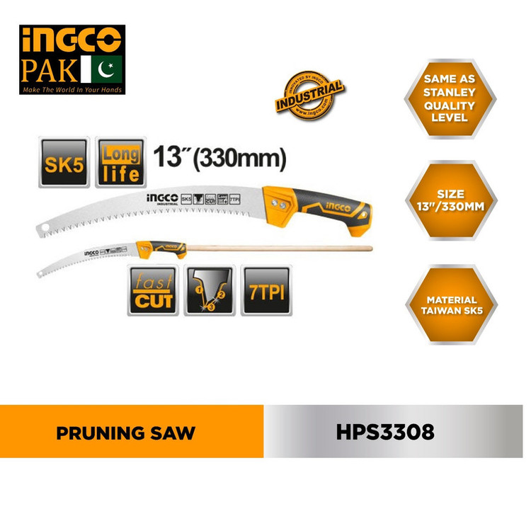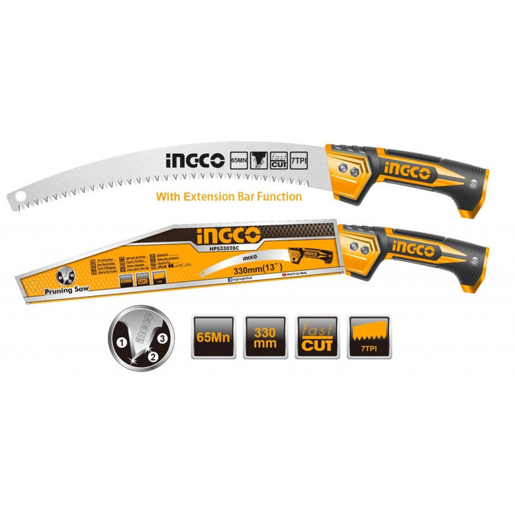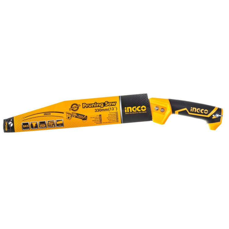 اره باغبانی 330 میلیمتری اینکو مدل HPS3308، ساخت کشور چین و تحت لیسانس کشور آمریکا میباشد. این اره باغبانی بسیار سبک و خوشدست است و دارای جنس تیغهی فولادی با سرعت برش بسیار بالاست. تیغهی این ارهی اینکو از فولاد SK5 ساخته شده است و 35 سانتیمتر طول دارد و به دندانههایی به صورت متقاطع (cross cut) مجهز است که در هنگام برش، جای برشی به شکل برآمده از خود به جا میگذارد. دندانههای این اره از نوع سه لبهی تیز است که قابلیت برش سه طرفه ( رو به جلو، رو به عقب، و عمقی) به آن میدهد و برای آن، سرعت و قدرت برش خوبی فراهم کرده است. تیغهی این ابزار باغبانی ، در هر اینچ، 7 دندانه دارد که این ویژگی نیز بر سرعت بالا و عمق برش آن اثر گذار است. دسته این اره دارای طراحی ارگونومیک و طول آن برابر با 17.5 سانتیمتر است و از پلاستیک TPR نرم بهرنگ مشکی-نارنجی ساخته شده که قابلیت ضد لغزش و ضد تعریق به آن داده است تا کاربر بهآسانی بتواند آن را در فعالیت های برشکاری مستمر، در دست نگهدارد و کار کند. تیغه ی این اره ی باغبانی به همراه دو پیچ و مهره به دسته متصل شده است. در انتهای دسته ی اره نیز محفظه ای تو خالی جهت نصب دسته ی چوبی یا فلزی مورد نظر تعبیه شده است تا سهولت کار برای برش شاخه هایی با ارتفاع بالاتر فراهم گردد. اره باغبانی اینکو در ابعاد 3.5×6×52.5 سانتیمتر با وزن 262 گرم ساخته شده است و بسیار سبک و خوشدست است. در نظر داشته باشید که طول قسمت دندانه دار این اره باغبانی 33 سانتی متر میباشد.