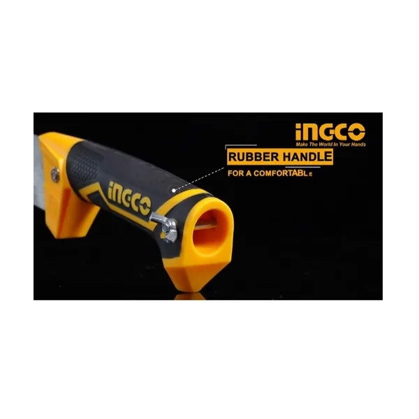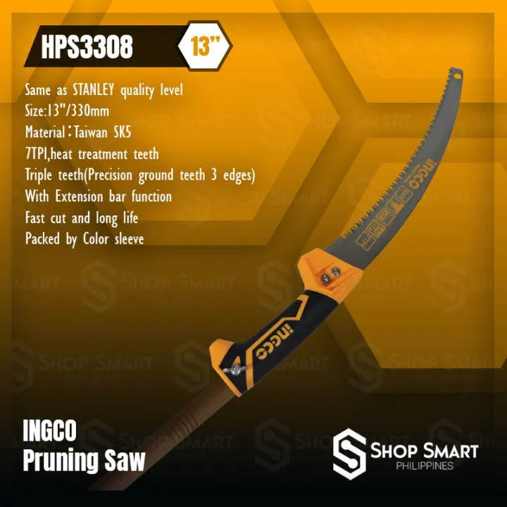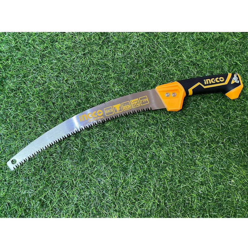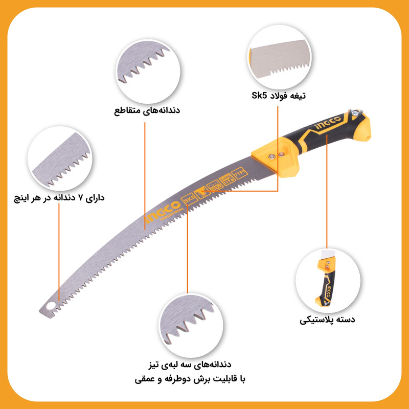 اره باغبانی 330 میلیمتری اینکو مدل HPS3308، ساخت کشور چین و تحت لیسانس کشور آمریکا میباشد. این اره باغبانی بسیار سبک و خوشدست است و دارای جنس تیغهی فولادی با سرعت برش بسیار بالاست. تیغهی این ارهی اینکو از فولاد SK5 ساخته شده است و 35 سانتیمتر طول دارد و به دندانههایی به صورت متقاطع (cross cut) مجهز است که در هنگام برش، جای برشی به شکل برآمده از خود به جا میگذارد. دندانههای این اره از نوع سه لبهی تیز است که قابلیت برش سه طرفه ( رو به جلو، رو به عقب، و عمقی) به آن میدهد و برای آن، سرعت و قدرت برش خوبی فراهم کرده است. تیغهی این ابزار باغبانی ، در هر اینچ، 7 دندانه دارد که این ویژگی نیز بر سرعت بالا و عمق برش آن اثر گذار است. دسته این اره دارای طراحی ارگونومیک و طول آن برابر با 17.5 سانتیمتر است و از پلاستیک TPR نرم بهرنگ مشکی-نارنجی ساخته شده که قابلیت ضد لغزش و ضد تعریق به آن داده است تا کاربر بهآسانی بتواند آن را در فعالیت های برشکاری مستمر، در دست نگهدارد و کار کند. تیغه ی این اره ی باغبانی به همراه دو پیچ و مهره به دسته متصل شده است. در انتهای دسته ی اره نیز محفظه ای تو خالی جهت نصب دسته ی چوبی یا فلزی مورد نظر تعبیه شده است تا سهولت کار برای برش شاخه هایی با ارتفاع بالاتر فراهم گردد. اره باغبانی اینکو در ابعاد 3.5×6×52.5 سانتیمتر با وزن 262 گرم ساخته شده است و بسیار سبک و خوشدست است. در نظر داشته باشید که طول قسمت دندانه دار این اره باغبانی 33 سانتی متر میباشد.