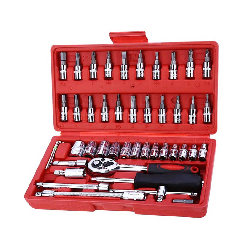جعبه بکس 46 پارچه 1/4 ، دارای کیفیت مشابه تایوانی ، آلیاژ : فولاد کروم وانادیوم سایز درایو : 1/4 ، مکانیسم ساخت : 6 پر ، سخت کاری شده و حرارت دیده شده و ماشین کاری شده می باشد . استاندارد متریک ، دارای 13 عدد سری بکس درایو 1/4 می باشد . سایز بکس ها : 4 ، 4.5 ، 5 ، 5.5 ، 6 ، 7 ، 8 ، 9 ، 10 ، 11 ، 12 ، 13 و 14 میلیمتر و دارای 21 عدد سری بکس پیچگوشتی شامل: 3 عدد سری پیچگوشتی چهارسو خاردار در سایزهای PZ1 ، PZ2 و PZ3 و 3 عدد سری دوسو در سایزهای SL4 ، SL5.5 و SL7 و 3 عدد سری چهارسو در سایزهای PH1 ، PH2 و PH3 و 6 عدد سری آلن ستارهای در سایزهای T10 ،T15 ،T20 ،T25 ،T30 ،T40 و 6 عدد سری آلن در سایزهای HEX7 ،HEX6 ،HEX5 ،HEX4 ،HEX3 ،HEX8 دارای 1 عدد آچار جغجغه ای به طول 15/5 سانتیمتر با درایو 1/4 اینچ ، دارای 1 عدد دسته ی پیچگوشتی به طول 15 سانتیمتر با درایو 1/4 اینچ ، دارای 2 عدد افزایندهی طول در سایزهای 10 و 5 سانتیمتر ، دارای 1 عدد افزایندهی طول فنری 14.5 سانتیمتری ، دارای 1 عدد آچار T به طول 11.5 سانتیمتر ، دارای 1 عدد سری آلن ، دارای 3 عدد آچار آلن با طول 4.5 سانتیمتر ، دارای 1 عدد لقلقه به طول 4 سانتیمتر و دارای باکس ضد ضربه بی ام سی می باشد . کشور تولید کننده : چین