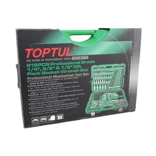 مجموعه ابزار 216 عددی تاپ تول، یکی از کامل ترین مجموعه بکس ها و آچارآلات این برند تایوانی است که با کیفیت فوق العاده ی ساخت و اهمیت به ظاهر محصول، با آبکاری منحصر بفرد آن، در بازار ایران، در بین شرکتها و کارخانجات، شناخته شده و امتحان خود را پس داده است. کیفیت بالای این محصول، موجب شده تا تعمیرگاهها و حتی برای مصارف خانگی هم مورد استقبال علاقمندان به برند تاپ تول قرار بگیرد.