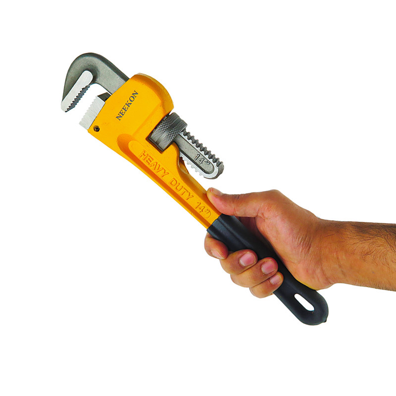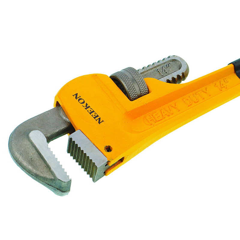 آچار شلاقی یکی از کاربردی ترین انواع آچار و ابزارهای دستی است و به واسطه فک قابل تنظیم خود بسیار کارآمد است. آچار شلاقی نیکون مدل NE-1414 سایز 14 اینچ با استفاده از تکنولوژی روز دنیا تولید شده و تمام خواسته های شما از یک آچار را برآورده میکند. این آچار روکش دار است و در قسمت دسته از روکش پلاستیک TPR ضد لغزش و تعریق برخوردار است و همچنین در قسمت فک آچار از فولاد فورج سختکاری شده استفاده شده که توانایی مقاومتی بالایی در برابر خوردگی و خم شدگی را دارد. این آچار در کشور مالزی تولید و به کشورهای جهان صادر شده است این آچار از لحاظ ظاهری با به کارگیری ترکیب رنگ زرد و مشکی ظاهری بسیار صنعتی و چشم نواز به خود بخشیده است
