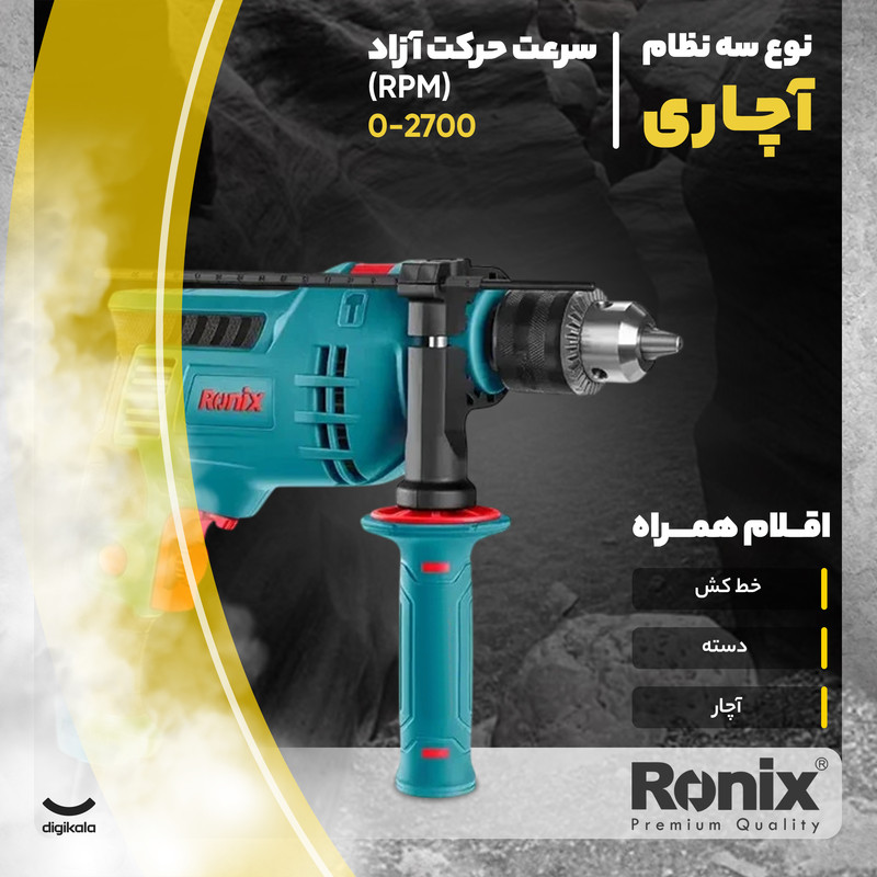 دریل چکشی 2211X رونیکس دارای یک موتور قدرتمند 750 واتی است که میتواند سرعتی بالغبر 2700 دور در دقیقه را ایجاد کند. این سرعت توسط کلید دیمردار کنترل سرعتی که در این ابزار تعبیه شده، قابل تنظیم است. همچنین با قابلیت چکشی در 2211X رونیکس، هیچ نگرانی در زمان سوراخکاری انواع مصالح نخواهید داشت. دامنه کاربری آن را بیشتر میکند. سهنظام 13 میلیمتری این دریل، تمامفلزی، مقاوم و از نوع آچاری است. طراحی ارگونومیک، کوچک، کمحجم و 1.73 کیلوگرمی (1.93 کیلوگرم با دسته )به منظور استفاده از ابزار در زمانی طولانیتر؛ ساختهشده از فیبر شیشهای تقویتشده (PA6+GF30)؛ خوشدست و قابل حمل؛ قابل استفاده در مکانهای مختلف؛ مجهز به دسته جانبی ارگونومیک با هدف کنترل بهتر دستگاه؛ دارای میله تنظیم عمق برای قابلیت سوراخکاری دقیقتر با عمق معین؛ دارای کابل 2 متری است.