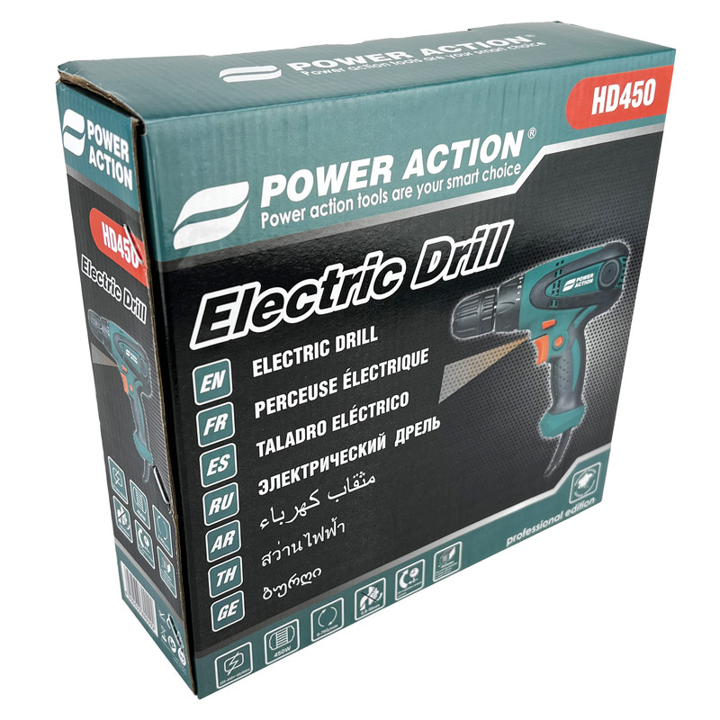 پیچ گوشتی برقی پاور اکشن یک ابزار 2 کاره که غالبا برای سوراخکاری و بستن پیچها بهترین گزینه میباشد و به نسبت به ابزار های هم رده یک گزینه عالی برای استفاده خانگی و کارگاهی محصوب میشود.پیچگوشتیهای الکتریکی توسط شرکتها و با برندهای مختلف در دو نوع برقی یا شارژی طراحی، تولید و عرضهشدهاند. این نوع ابزار کمک بسیار زیادی به سرعت عمل شما در باز کردن یا بستن پیچها و مهرهها با سریهای مختلف میکند. یکی از ویژگی های منحصر به فرد این پیچگوشتی ترکمتر 19 تا 1 حالته آن است که با چرخاندن آن میتوان فشار مورد نیاز را به پیچ وارد کرد تا در اثر فشار بیش از حد پیچ، به محصولتان آسیبی وارد نکند. سیم پیچ این دستگاه 100% مسی بوده که باعث عمر مفید طولانیتر دستگاه میشود، این دریل پیچ گوشتی برقی با توان موتور قدرتمند 450 وات واقعی و سرعت گردش 750 دور در دقیقه و سه نظام 10 میلیمتری دقیق اتومات یکی از محصولات کارآمد در ابزارآلات میباشد. از دیگر مزیت های بزرگ این وسیله سرعت بالای آن است. سرعت گردش محور این محصول تقریبا دو برابر سریعتر از دریل های معمولی است. یعنی بستن پیچ های خیلی بلند (15 سانتی متر یا بیشتر) زمان کمتری از کاربر می گیرد. به علاوه پیچ گوشتی های برقی سبک تر از دریل ها هستند و این مزیت زمانی که می خواهید فعالیتی طولانی مدت انجام بدهید یا تعداد زیادی پیچ ببندید بیشتر به چشم میآید. اگر صرفهجویی در زمان برای شما اهمیت دارد، پیچ گوشتی برقی پاور اکشن از وسایل ضروری در جعبه ابزار شما است. این محصول در بسیاری از فعالیتهای خانگی، صنعتی، ساختمانی و کارگاهی کاربرد دارد. در مجموع دریل HD 450 میتوان بهترین ابزار در رده خود معرفی کرد.