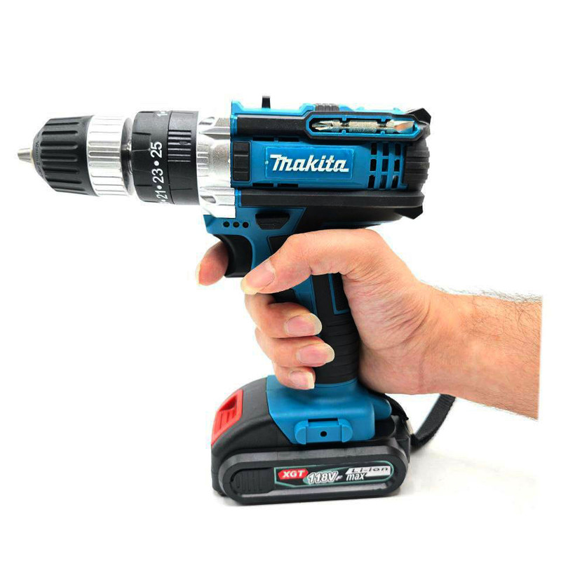 دریل شارژی 118 ولت چکشی دو باتری طرح ماکیتا که این دریل با مارک برجسته ارائه میگردد و طرح ماکیتا می باشد و تفاوتی با اصل آن دارد همچنان که از نظر قیمتی هم بسیار متفاوت می باشد مشخصات این محصول عبارتند از : چکشی و مارک برجسته و سه نظام نیمه فلزی و دو عدد باتری ۱۱۸ ولت لیتیوم و گیربکس دو دور و دور ۰ تا ۳۵۰ و ۰ تا ۱۱۵۰ دور بر دقیقه و قابلیت کنترل سرعت فشاری و چپگرد و راستگرد و به همراه لوازم همراه؛ مته آهن( سایز ۳، ۴ و ۵ میلیمتر)، مته چوب( سایز ۳، ۴ و ۵ میلیمتر)، رابط فنری تاشونده، سه عدد نوک پیچ گوشتی چهارسو و سه عدد دو سو، بکس(سایز ۴، ۴.۵، ۵، ۶، ۷، ۸، ۹، ۱۰و ۱۲ میلیمتر) و تبدیل بکس خور سر دریلی سایز ۱/۴ که همه اینها در یک کیفBMC قراردارند می باشد .