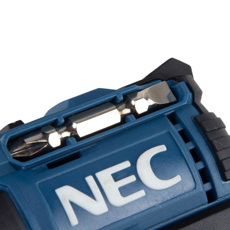 دستگاهی که در تصویر مشاهده میکنید توسط شرکت معتبر ان ای سی (NEC) تولید میشود. با کمک این دستگاه میتوان فرایند سوراخکاری و باز و بسته کردن پیچها را به خوبی انجام داد. این دستگاه مدل (NEC 1515) نام دارد و در گروه دستگاههای شارژی قرار میگیرد. محصول فوق نیروی خود را از طریق یک باتری12 ولتی تامین میکند. این باتری از نوع لیتیوم کره بوده و ظرفیتی برابر 2 آمپرساعت دارد. سرعت گردش این دستگاه قابل تنظیم است و کاربر با تغییر میزان فشار انگشت خود روی شستی میتواند آن را تغییر دهد. این سرعت در دو بازهی 400-0 و 1400-0 دور بر دقیقه قرار دارد. سرعت اول برای باز و بسته کردن پیچ مورد استفاده قرار میگیرد و سرعت دوم برای انجام سوراخکاری مناسب است. یکی از نقاط قوت این دستگاه حالت ضربهای دریل آن است. این حالت در سوراخکاری سطوح سخت، به کاربر کمک زیادی میکند و نرخ ضربهی آن بین بازهی 400-0 و 1450-0 ضربه در دقیقه قرار دارد. سه نظام به کار رفته در ساخت این دستگاه از نوع 10 میلیمتری خودکار بوده و حداکثر قطر سوراخکاری آن در چوب، فلز و مصالح به ترتیب برابر 18، 10 و 10 میلیمتر است. این دریل پیچگوشتی دارای لامپی ال ای دی بوده که موجب روشن شدن سطح مورد نظر میشود. دستهی محصول فوق به شکلی ارگونومیک طراحی شده و به روکشی ضد لغزش مجهز است.