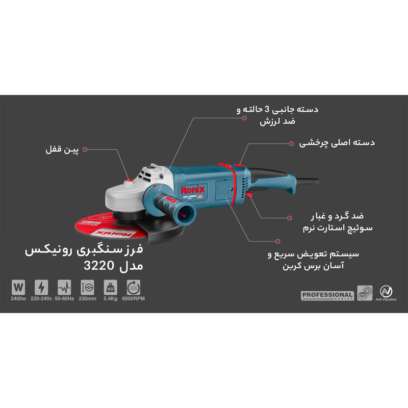 فرز سنگبری پیش روی شما یکی از محصولات تولیدی شرکت معروف «رونیکس» (Ronix) است. این دستگاه مدل «3220» نام دارد و از سرعت چرخشی برابر 6000 دور بر دقیقه برخوردار است. این فرز باتوجه به سرعتی که دارد برای برش سنگ مورد استفاده قرار میگیرد و این میزان سرعت برای برش سنگها بهترین است. قطر صفحهی مناسب برای این دستگاه 230 میلیمتر است. شرکت رونیکس برای این دستگاه یک کابل بلند 4 متری با کیفیت طراحی کرده است و برای راحتی بیشتر کاربر در حین کار، یک دستهی کمکی به همراه آن عرضه میکند. این دسته در سه سمت دستگاه قابل نصب بوده و طراحی مناسبی دارد. از دیگر مزایای این دستگاه میتوان به وجود قفل اسپیندل و محافظ صفحهی آن اشاره کرد که ایمنی بیشتری به دستگاه بخشیده است. قسمت انتهایی این فرز سنگبری نیز قابل چرخش بوده و کاربر میتواند با فشار دکمهی آن این کار را انجام دهد. این دستگاه وزنی حدود 5.2 کیلوگرم دارد.