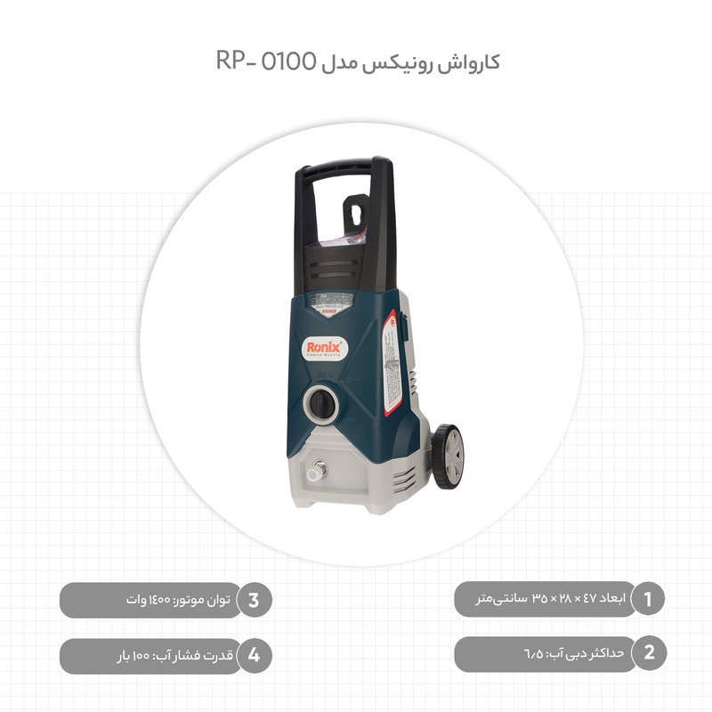 محصولی که مشاهده میکنید، کارواش مدل «RP-0100» است. این کارواش را یکی از شرکتهای داخلی تولید میکند. موتور در نظر گرفتهشده برای این محصول از قدرت قابلقبولی برخوردار است. طول شلنگ نیاز به جابهجایی محصول را در زمان استفاده کاهش میدهد؛ بااینحال جابهجایی این دستگاه با توجه به امکانات در نظر گرفتهشده، بسیار آسان است. شکل پاشش آب، توسط لوازم جانبی محصول قابلتنظیم است. این دستگاه ازجملهی محصولات شرکت «رونیکس» (Ronix) محسوب میشود. موتور این دستگاه از نوع القایی است و توانی برابر با 1400وات دارد. این قدرت موتور باعث میشود تا آب با فشار 100 بار و دبی 6.5 لیتر بر دقیقه از نازل کارواش خارج شود. طول شلنگ این محصول 5 متر است؛ بنابراین در زمان استفاده از کارواش نیاز چندانی به جابهجایی محصول پیدا نمیکنید. امکان اضافهکردن یک مخزن مواد شوینده به مسیر شستوشوی کارواش هم وجود دارد. برای تنظیم شکل پاشش آب باید از دو عدد لنس قابلتنظیم استفاده کنید. بهتازگی استفاده از کارواشهای خانگی رواج بیشتری پیدا کرده است. ازجمله دلایل این موضوع میتوان به افزایش اهمیت نظافت محیط زندگی، صرفهجویی در مصرف آب و هزینههای آن، کاهش نیاز مراجعه به کارواش جهت شستوشوی خودرو (و پرداخت هزینههای مکرر) و استفادهی راحت از این دستگاه اشاره کرد. شرکت رونیکس هم مدل RP-0100 را با در نظر گرفتن این موارد و با یک موتور 1400واتی تولید کرده است. این دستگاه آب را با فشار 100 بار در اختیار کاربر قرار میدهد.