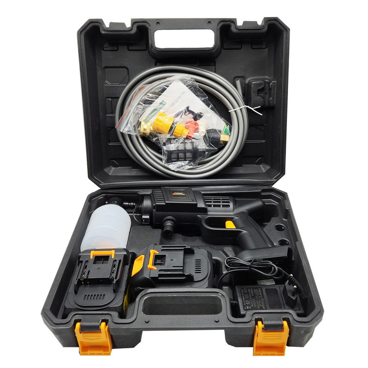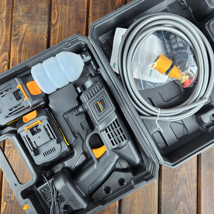 کیف حمل، گان بلند، شلنگ ورودی و یک عدد اتصالات ورودی و فیلتر و دو عدد سری تنظیم پهنای پخش آب (تبدیل قرمز و سفید)