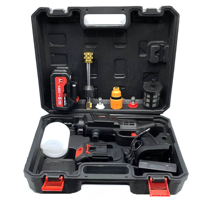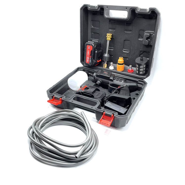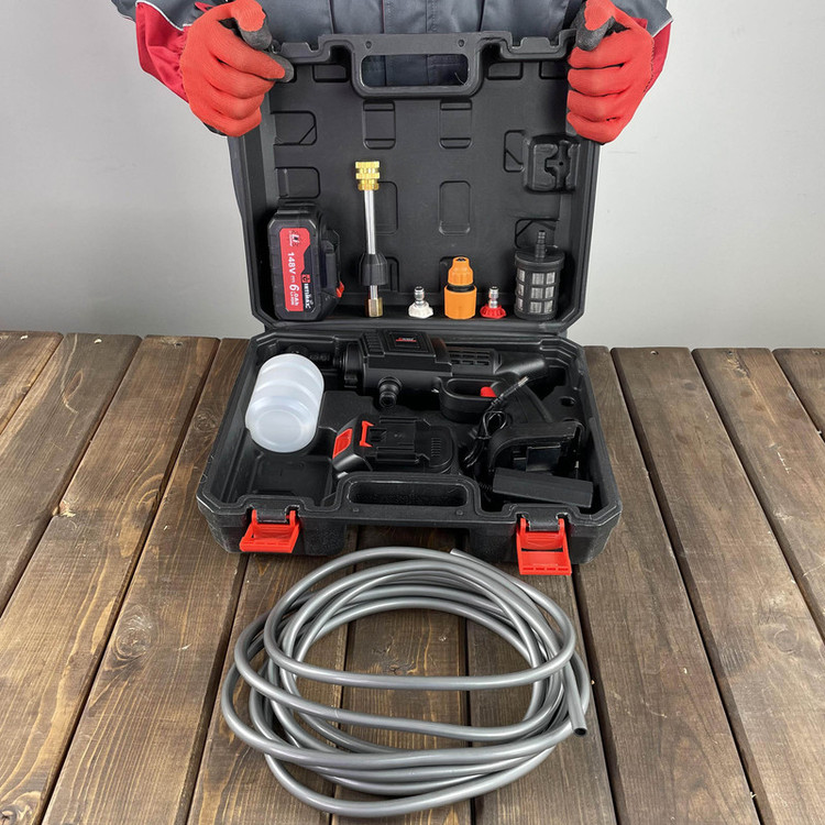 کیف حمل، گان بلند، شلنگ ورودی و یک عدد اتصالات ورودی و فیلتر و دو عدد سری تنظیم پهنای پخش آب (تبدیل قرمز و سفید)