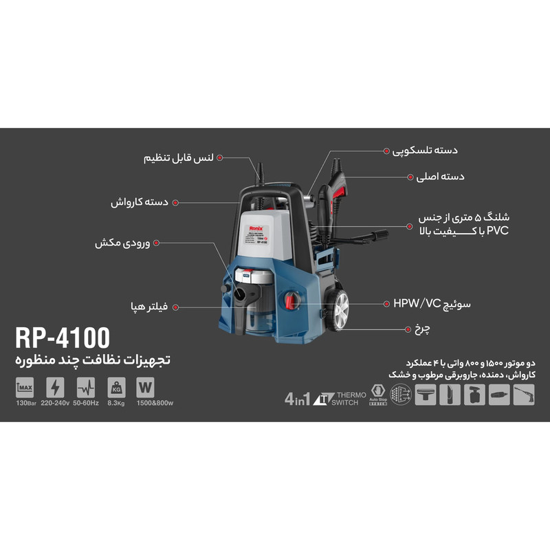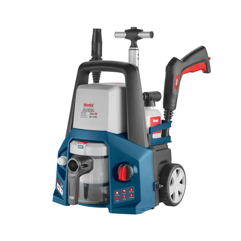 کارواش چهار کاره رونیکس مدل RP-4100 سری جدید ، مجهز به موتوری قدرتمند با توان 1500 وات است که باعث افزایش فشار و قدرت در تمیزکاری می شود. این دستگاه دارای سیستم سوئیچ اتو استاپ است که در صورت رها کردن ماشه توسط کاربر کارواش به صورت خودکار موتور را خاموش می کند، که این ویژگی باعث افزایش طول عمر موتور شده و نیز از اتلاف انرژی جلوگیری میکند. این کارواش مجهز به سیستم حفاظت گرمایی است که هنگام افزایش دمای آن موتور را به صورت خودکار خاموش کرده و از استهلاک قطعات داخلی دستگاه جلوگیری می کند و همچنین عمر دستگاه را افزایش می دهد. تفنگ آب پاش پیشرفته این کارواش در موارد مختلفی کاربرد داشته و کار با آن بسیار آسان و راحت می باشد. این دستگاه دارای کوپلینگ اتصال سریع جهت اتصال و جدا کردن سریع شلنگ نیز میباشد. این کارواش مجهز به نازل های قابل تنظیم و توربو است که از مواد اولیه باکیفیت ساخته شده و باعث تسلط بیشتر کاربر و تنظیم و کنترل زاویه پاشش می شود. این کارواش دارای مخزن مواد شوینده خارجی جهت افزایش قدرت تمیزکاری و نیز کاهش زمان فرآیند نظافت و شستشو است. این محصول به منظور حمل و نقل آسان تر و اشغال فضای کمتر دارای چرخ و دسته تلسکوپی ارگونومیک است. این کارواش چهار کاره جهت جذب ذرات معلق در هوا دارای فیلتر HEPA است که کارایی این دستگاه را به حداکثر میزان ممکن می رساند. کارواش چهار کاره رونیکس مدل RP-4100 دستگاهی چهار کاره با قابلیت استفاده به عنوان کارواش و جارو برقی خشک و تر و نیز دمنده است. کارواش آب را به وسیله نازل آب با فشار بالایی به روی سطوح مورد نیاز هدایت می کند و فشار بالای آب سطح مورد نظر را تمیز می کند. به همین دلیل کارواش از وسایل کاربردی در صنایع مختلف به شمار می آید. کارواش ها انواع مختلفی داشته و با توجه به نوع کابرد انتخاب می شوند. از مزیت های کارواش به صرفه جویی در مصرف آب و زمان و نیرو می توان اشاره کرد. با استفاده از کارواش می توان آلودگی را از روی سطوح مختلف مانند: ماشین، سالن های بزرگ و پارکینگ و... با سرعت و فشار بسیار بالایی از بین برد.