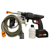 کارواش شارژی 48 ولت cleaning gun همراه با اداپتور 16 امپر MSOU به همراه باتری لیتیومی و مخزن کف پاش و فیلتر انتهایی شیلنگ . دارای کوپلینگ نگهدارنده شیلنگ به اب شهری(نیازی به بست شیلنگ نمیباشد). دارای دو عدد نازل پاشش اب به صورت تیز و پهن که جهت مصارف کارواش و سمپاش قابل استفاده میباشد. این دستگاه مجهز به سیستم مکش بوده و نیازی به اب پرفشار شهری ندارد و شما میتوانید با استفاده از یک مخزن اب یا بطری از ان بهره مند شوید.