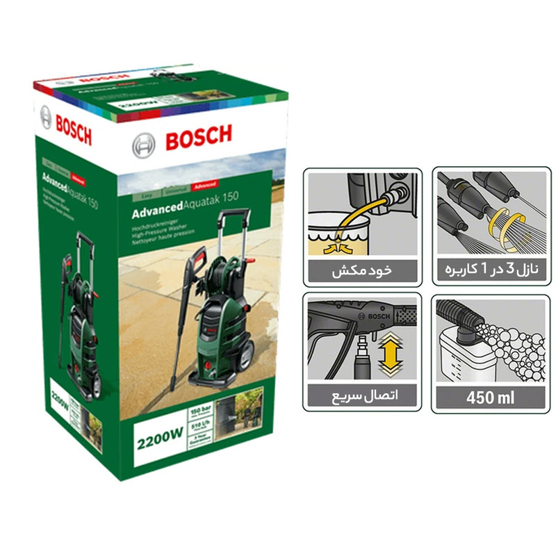 شرکت (Bosch) «بوش» یکی از بزرگترین و معروفترین شرکتهای تولید لوازم و دستگاههای خانگی و صنعتی است که سالهاست در این زمینه فعالیت میکند. اینروزها کمتر کسی است که نام این برند معروف را نشنیده باشد و از کیفیت محصولاتش بیخبر باشد. این شرکت یکی واز جدیدترین محصولاتش را به نام کارواش مدل Advanced Aquatak 150 به بازار عرضه کرده است.کارواش بوش مدل Advanced Aquatak 150 را میتوان محصولی تمام عیار از شرکت بوش آلمان دانست که همیشه در تولید ابزار آلات صنعتی در دنیا بی رقیب بوده است . کارواش بهصورت هوشمند عمل کرده و دارای سامانه توقف خودکار دستگاه است. این قابلیت باعث میشود تا هنگامی که کاربر با دستگاه کار نمیکند، دستگاه متوقف شده و در مصرف آب و برق صرفهجویی شود.این دستگاه توان بسیار بالایی برابر 2200 وات دارد که قادر است آب را با حداکثر فشار برابر 150 بار از نازل خود خارج کند. نازل لنس دستگاه نیز به شکل سه در یک بوده و قادر است جریان خروجی را در سه حالت مختلف ساده، چرخشی و همراه با حباب هوا در اختیار کاربر قرار دهد. بزرگترین ویژگی این دستگاه کارواش پمپ تمام فلزی 4 سیلندری فسفر برنزی ضد اسید و خوردگی آن می باشد . این دستگاه مجهز به سیستم پیشرفته فوم پاش می باشد . این دستگاه مجهز دارای سیستم ساکشن حرفه ای می باشد . طول لنس این دستگاه 8 متر می باشد . بسیاری از موارد کیفی و زیبایی منحصر به فرد این دستگاه باعث شده این دستگاه در نوع خود در دنیا بی رقیب باشد .