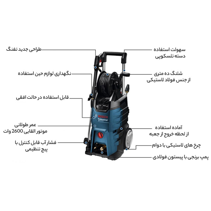 کارواش «Bosch» «بوش» جهت شستوشوی آسان به بازار عرضه شده است. مدل این محصول (GHP 5-65 X) نام دارد. توان این کارواش 2400 وات بوده و قدرت فشار آب آن 130 بار است. این فشار آب به شما کمک میکند تا بهراحتی هرگونه آلودگی را از سطح مورد نظر پاک کنید. کارواش بوش را میتوانید در حالت عمودی و افقی استفاده کنید. این مزیت نیز به شما کمک میکند تا حتی نقاطی که به آنها دسترسی ندارید را بتوانید بشویید. اتصالات موجود در این مجموعه به راحتی نصب میشوند و در شرایط مختلف میتوانید از آنها استفاده کنید. قابلیت پاشش آب و مواد شوینده در سه حالت مختلف، قابلیت قرار دادن اتصالاتی مانند تفنگی و شلنگ روی بدنه، قابلیت مکش آب از مخزن و قابلیت ترکیب جریان آب و هوا برای تمیزکاری بهتر از دیگر خصوصیات GHP 5-65 X هستند. وجود چرخهایی بزرگ و دستهی تلسکوپی از جنس فولاد ضد زنگ، حمل و نقل کارواش بوش را آسان میکنند. این محصول دارای شلنگ جع کن بوده و به شما این امکان را میدهد تا پس از استفاده بهراحتی شلنگ را جمع کنید.
