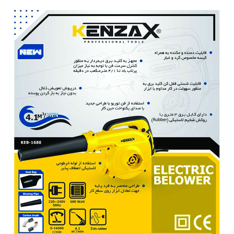 محصول فوق یکی دیگر ازمحصولات برقی تولیدی شرکت «کنزاکس» (Knzax) میباشد. بلوور برقی مدل KEB-1680 دارای موتور پرقدرت 680 وات است؛ که مجهز به فن پرقدرت و توربو با طراحی جدید و صدای یکنواخت حین کار می باشد. این محصول دارای قابلیت دمنده و مکنده به صورت همزمان می باشد. این دستگاه به کلید دیمر دار بمنظور تغییر سرعت روی بدنه همچنین به شصتی قفل کن حین کارکرد با دستگاه مجهز شده است و دارای لوله دمنده و مکنده لاستیکی و کابل رابرروکش ضخیم 3 متری می باشد. با توجه به قابلیت های در نظر گرفته شده موجب سهولت در در انجام کار مداوم می باشد . کلید دیمردار در نظر گرفته تا سرعت پرتاب باد را کم یا زیاد نماید. حداکثر پرتاب و خروجی باد تولید شده این دستگاه تا 4.1 متر مکعب در دقیقه میرسد . لوله خرطومی انعطاف پذیر و کیسه جمع کننده گرد و خاک با قابلیت تخلیه سریع از مشخصه های این دستگاه است. طراحی آرگونومیک دسته باعث جلوگیری از خستگی و تعریق میشود. به همراه این دستگاه 2 عدد ذغال یدک ارایه گشته است که با توجه به طراحی خاص کنزاکس تعویض زغال ها بی نیاز از بازکردن پوسته دستگاه خواهد بود . طراحی منحصر به فرد پایه جهت حفظ تعادل ابزار روی سطح کار
