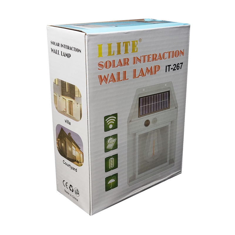 چراغ دیوارکوب خورشیدی ILITE مدل IT-267 برای نصب روی دیوار باغ و یا سردر ساختمان ها و مجتمع های مسکونی و یا هر مکان دیگری که در طول روز امکان تابش نورخورشید وجود داشته باشد مناسب است . دستگاه از یک پنل خورشیدی با ابعاد 7 در 5 سانتیمتر برای شارژ باتری لیتیوم یون داخل دستگاه بهره می برد و به هنگام شب با عبور افراد از نزدیکی آن با دارا بودن سنسور PIR بطور خودکار روشن شده و با سپری شدن مدت زمان کوتاه و با نبود و عدم حضور فرد در مقابل آن خاموش می شود . زاویه تشخیص و عملکرد سنسور از طرفین 60 درجه بوده و با قرار گرفتن انسان و موجودات زنده در محدوده این زاویه لامپ روشن می شود . لامپ دستگاه بصورت حبابی ساخته شده ولی سیستم روشنایی آن ال ای دی با نور زرد رنگ است که لامپ های رشته ای قدیمی را در ذهن تداعی می کند . شدت نور را می توان در 3 وضعیت با فشردن متوالی دکمه سیاه رنگ کنار سنسور ، تنطیم کرد . بدیهی است که دستگاه را می توان در فضای باز و در معرض بارش باران نصب کرد .