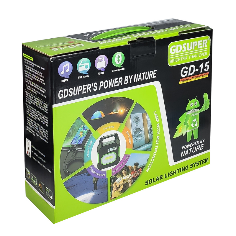 بهره برداری از انرژی های نو و پاک روز به روز در حال افزایش است که خود موجب بهتر شدن شرایط زیست در کره زمین می شود . یکی از این گونه های انرژی پاک ، انرژی خورشیدی است که به دو روش تولید می شود که یکی در نیروگاههای حرارتی خورشیدی و دومین روش ، تولید برق در نیروگاه های با پنل های خورشیدی می باشد . در ابعاد کوچکتر می توان از این انرژی با پنل خورشیدی بهره گرفته و انرژی الکتریکی تولید شده را در باتری های شارژی ذخیره کرد و به هنگام نیاز ، از آن بهره گرفت . سیستم خورشیدی GDSUPER مدل GD-15 یکی از این دستگاهها است که از یک دستگاه اصلی با 2 منبع روشنایی بر روی خود که یک عدد بصورت چراغ قوه در قسمت مقابل و دو منبع بصورت یک لامپ ال ای دی COB و لامپ مهتابی در قسمت جانبی آن قرار دارد ، تشکیل شده است . یک پنل خورشیدی 9 ولتی با توان 3.5 وات از اجزای دیگر این سامانه است که با سیم 4 متری و یک فیش در انتهای آن ، قابلیت اتصال به دستگاه اصلی را داشته و درصورت قرار گرفتن در مقابل نور مستقیم خورشید ، توان لحظه ای 3.5 وات را در دستگاه شارژ می کند . همچنین 3 عدد لامپ ال ای دی با سیم 4 متری و کلید ، در جعبه دستگاه قرار دارد که با اتصال به دستگاه اصلی می توان از روشنایی آن برخوردار شد . .همچنین این دستگاه دارای یک سیستم صوتی برای پخش فایل های صوتی از طریق بلوتوث یا فلش مموری و کارت حافظه نیز می باشد که آن را به یک دستگاه کامل برای پیک نیک تبدیل کرده است که با داشتن پاور بانک و امکان شارژ موبایل و دستگاههای مشابه که با کابل شارژ چند کاره همراه و یا هر کابل دلخواهی انجام می شود این دستگاه یک وسیله ضروری و مورد نیاز در سفر و پیک نیک شده و استفاده از آن اجتناب ناپذیر خواهد بود .