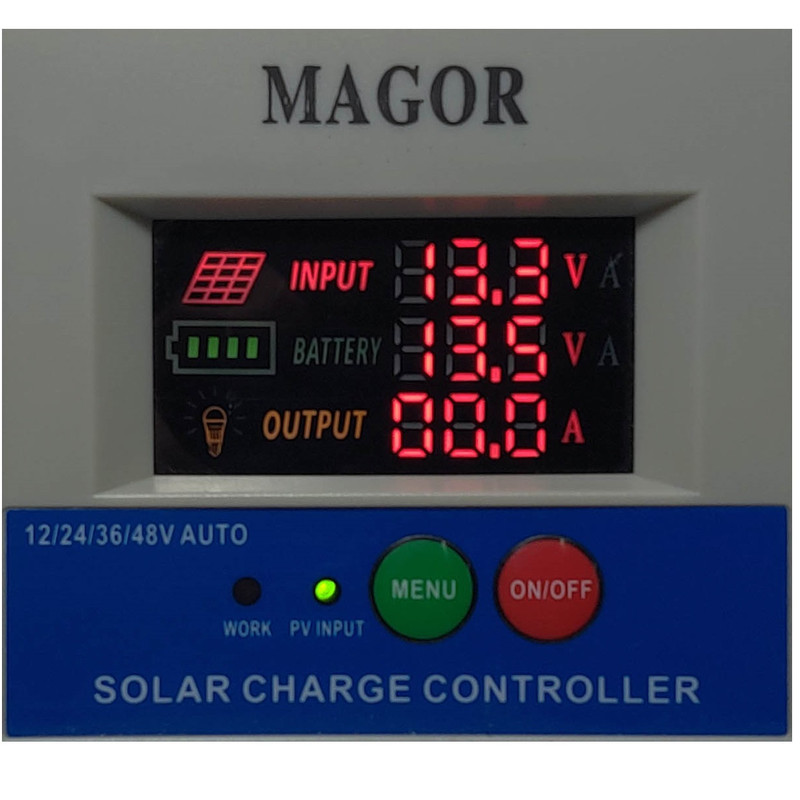 با بکار گیری روز افزون پنل های خورشیدی ، شارژ بار اضافی جهت ذخیره و یا تثبیت ولتاژ خروجی ، نیازی ضروری محسوب می شود . در صورتی که باتری به حد ماکزیمم انباشت بار برسد ، شارژ اضافه انجام نشده و تنها باتری آسیب پذیر خواهد شد به همین جهت نیاز است تا دستگاهی هر لحظه میزان شارژ را با سنجش دقیق ولتاژ باتری رصد کرده و به موقع لزوم ، دستور قطع و یا به موقع رسیدن به حد پایین ولتاژ ، دستور وصل را صادر کند . این دستگاه را می توان برای پنل شارژ کننده باتری 12 ولت که بیشینه ولتاژ آن 18 ولت است و همچنین پنل شارژ کننده باتری 24 ولت استفاده کرد و تشخیص نوع باتری و پنل بطور خودکار توسط دستگاه انجام می شود .( این دستگاه قابلیت استفاده و کنترل شارژ تمام باتری های 12 و 24 ولت از طریق ترانسفورماتور و یا دینام و هر منبع شارژ دیگری را نیز دارد و فقط برای شارژرهای خورشیدی نیست . البته ولتاژ شارژ توسط ترانسفورماتور و یا دینام باید حدود 14 تا 14.4 ولت برای باتری 12 ولت و 28.8 ولت برای باتری 24 ولت باشد ) . این کنترلر شارژ تا سقف 60 آمپر ساعت برای باتری های 12 و 24 امکان شارژ را دارد . دستگاه فوق علاوه بر قطع و وصل شارژ باتری ، جریان لحظه ای خروجی از پنل خورشیدی و ولتاژ آن را نیز نشان می دهد ( برای نشان دادن جریان باید دکمه menu یا همان دکمه سبز را یک بار فشار داد) و برای خروجی دستگاه نیز جریان خروجی یا همان مصرف کننده بصورت لحظه ای نمایانگر است . ولتاژ باتری نیز همواره در معرض نمایش است برای اینکه نمایش ارقام بر روی پنل دستگاه نمایان شود باید باتری را به آن متصل کرد . دستگاه 6 ترمینال برای ورود 6 سیم دارد که به ترتیب از سمت چپ 2 ترمینال برای اتصال به پنل خورشیدی و 2 ترمینال وسط برای اتصال به باتری و دو ترمینال سمت راست به مصرف کننده متصل می شود و در غیر این صورت و تنها با اتصال پنل خورشیدی هیچ کمیتی بر روی پنل دستگاه مشاهده نخواهد شد. دستگاه قابلیت سنجش دما را نیز داشته و با در فرآیند شارژ دمای محیط را تاثیر می دهد تا شارژ بصورت بهینه انجام گیرد .