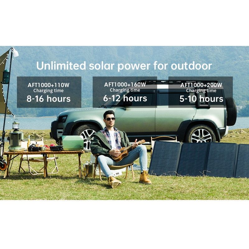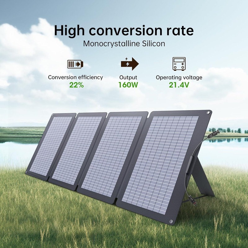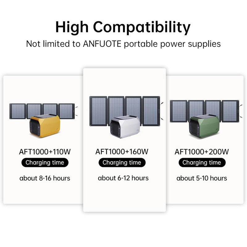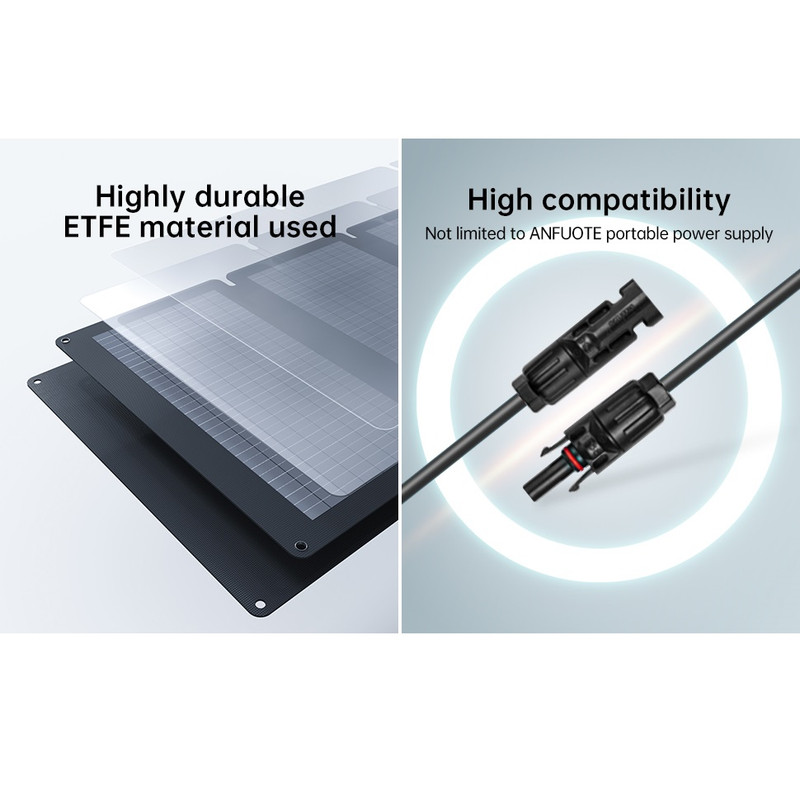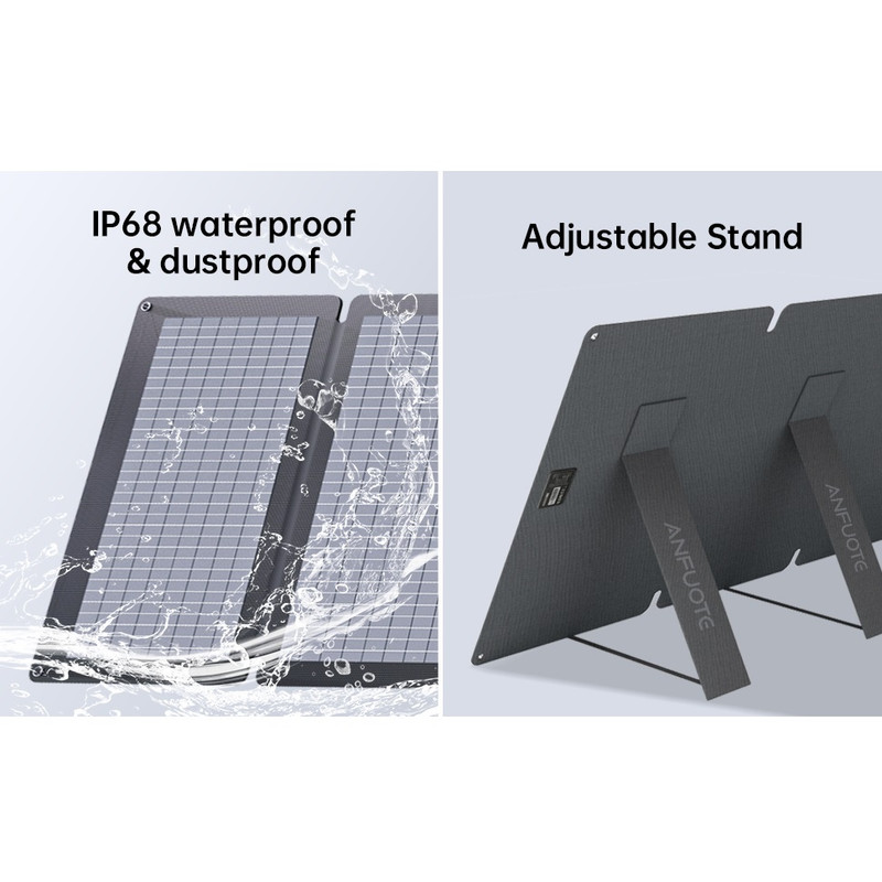 ضد آب و گرد و غبار با استاندارد IP68 : پنل خورشیدی ضد آب و ضد گرد و غبار است و میتواند برای فعالیتهای فضای باز مانند کوهنوردی، ماهیگیری و کمپینگ مورد استفاده قرار گیرد. کیف نیز از مواد ضد آب ساخته شده است، بنابراین میتوانید با اطمینان از آن استفاده کنید، حتی اگر در اثر باران سبک کمی خیس شود. راندمان تبدیل بالا : نرخ تبدیل انرژی خورشیدی این پنلهای خورشیدی به ۲۲٪ رسیده است و میتوان چندین پنل باتری را به صورت سری یا موازی برای شارژ به هم متصل کرد. تاشو، حمل آسان : اندازه نگهداری: حدود ۶۸۵x۴۲۵x۴۰ میلیمتر، اندازه بزرگشده: حدود ۶۸۵x۱۵۹۰x۲۶ میلیمتر. طراحی آن با پایه قابل تنظیم انجام شده و نیازی به کارهای نصب پیچیدهتر ندارد. این دستگاه میتواند نور خورشید را به طور مؤثر جمعآوری کند و در تولید برق راندمان بالایی داشته باشد، که آن را برای استفاده در فضای باز ایدهآل میکند. در حالت تاشده جمعوجور و سبک است، بنابراین هنگام نگهداری فضای زیادی را اشغال نمیکند. سازگاری بالا : مشخصات پنلهای خورشیدی ۱۶۰ وات عبارتند از ولتاژ مدار باز ۱۸.۲ ولت/۸.۸ آمپر/حداکثر خروجی ۱۶۰ وات. یک کابل Multi Conector-4 برای اتصال آسان به بسیاری از نیروگاههای قابل حمل ارائه میشود. توصیه میکنیم از آن به همراه یک نیروگاه قابل حمل ANFUOTE استفاده کنید.