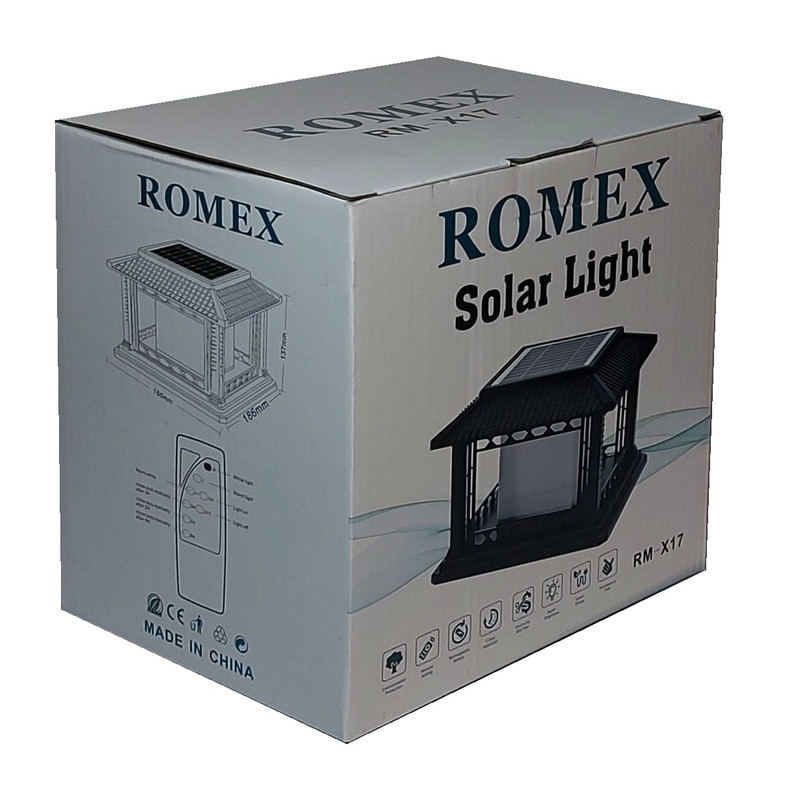 چراغ باغی خورشیدی ROMEX مدل RM-X17 برای نصب در حیاط منازل ویلایی و یا باغها یک گزینه بسیار خوب می باشد چون با دارا بودن پنل خورشیدی با توان مناسب 2.5 واتی ، می تواند در روز نور خورشید را به انرژی الکتریکی تبدیل و در باتری شارژی داخلی ذخیره کند و در شب در صورت نیاز با ریموت کنترل آن را به رنگ دلخواه نور ، روشن کرد رنگهای نور مورد نظر زرد ، آفتابی و مهتابی بوده و علاوه بر انتخاب رنگ، با ریموت می توان مجموع ساعاتی که نیاز به روشنایی می باشد را انتخاب کرد . همانطور که از تصاویر مشخص است در داخل این چراغ یک سرپیچ سرامیکی E27 قرار دارد تا بتوان یک لامپ معمولی را در آن نصب کرده و با برق شهر روشن کرد و در واقع این یک چراغ دومنظوره برقی و خورشیدی است .