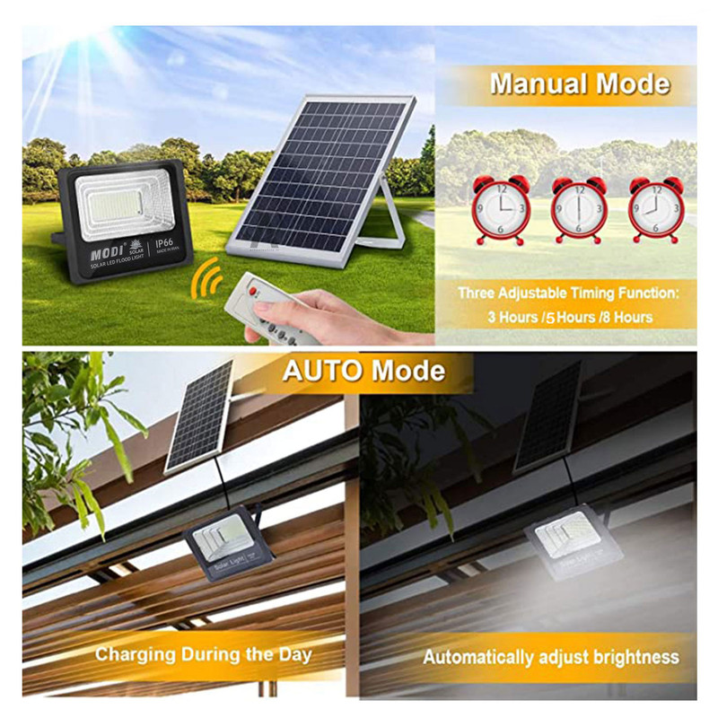 بهره وری از انرژی خورشیدی روز به روز در حال گسترش است. استفاده از این منبع انرژی بی پایان علاوه بر رایگان بودن ، برای محیط زیست و بهتر شدن آب و هوای کره زمین نیز موثر است. سیستم خورشیدی مودی مدل IR-MD7250 برای تامین روشنایی اماکنی که نیاز به نورپردازی دارند مانند سر در فروشگاهها و یا باغها و پارکها و همچنین کمپ های طبیعت گردی و ... مناسب است. با نصب پنل خورشیدی دستگاه در مکانی که در روز بیشترین امکان تابش مستقیم نور خورشید را داشته باشد و اتصال کابل آن به پروژکتور که در داخل آن باتری شارژی لیتیوم یون قرار دارد ، باتری داخلی شارژ می شود و در شب هنگام بطور خودکار و یا با استفاده از ریموت کنترل آن را در وضعیت روشن و یا خاموش و یا وضعیت 3 ، 5 یا 8 ساعت روشن قرار داد. پروژکتور بطور کامل ضد آب بوده ( IP66 ) و در زیر باران و در محیط کاملا باز می توان آن را نصب کرد و از نور درخشان 50 وات آن در شب بهره برد و علاوه بر صرفه جویی در مصرف برق در شرایط بی برقی نیز از نور آن برخوردار شد. ریموت کنترل دستگاه تعداد 8 عدد دکمه دارد که با فشردن یک دکمه پروژکتور در وضعیت روشن و خاموش قرار می گیرد و با یک دکمه دیگر ( Auto ) با تاریک شدن محیط پروژکتور روشن می شود . سه دکمه دیگر وضعیت تایمر را برای روشن ماندن پروژکتور فعال می کنند و دو دکمه دیگر نیز برای کنترل شدت نور پرژکتور می باشد. با شارژ کامل باتری داخلی پروژکتور توسط نورخورشید در روز، می توان از 12 ساعت روشنایی آن در هنگام شب برخوردار شد که اغلب تا روشن شدن محیط و روز شدن محیط ، روشنایی آن برقرار است .
