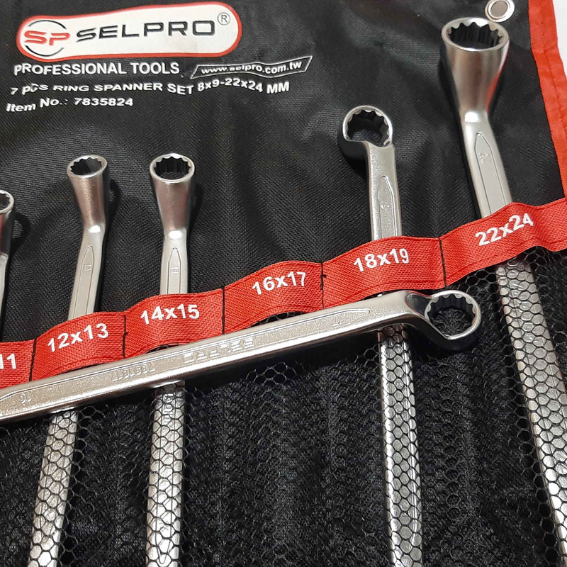 مجموعه 7 عددی آچار دو سر رینگ سلپرو ساخت تایوان. کیفیت ساخت آچارآلات سلپرو بسیار بالا می باشد و این ست 7 عددی از سایز 8 تا 24 را در بر میگیرد. سایز آچار ها از روی تصویر محصول قابل مشاهده است.