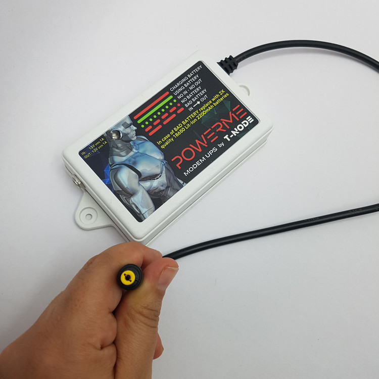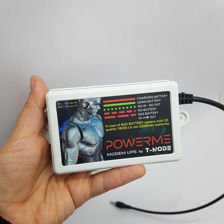 UPS (برق اضطراری) مودم ADSL و مودم فیبرنوری و تک دوربین های نظارتی موتور دار به سادگی بین آداپتور و مودم / دوربین قرار گرفته و در صورت قطع برق، دستگاه را ساعت ها روشن نگه می دارد. دارای دو عدد باتری بسیار با کیفیت لیتیومی کمیلیون 18650 با ظرفیت 2200 میلی آمپر ساعت. این دستگاه مودم های معمولی با 2 عدد آنتن را تقریبا 3 ساعت تغذیه می کند. در صورت استفاده برای مودم ها یا روتر های چهار آنتن ممکن است این زمان کاهش پیدا کند. این دستگاه دارای برد هوشمند برای کنترل شارژ و دشارژ و بررسی سلامتی باتری ها می باشد و LED روی دستگاه نشان دهنده وضعیت کارکرد و سلامت باتری است. باتری های دستگاه بر خلاف مدل های مشابه به سادگی قابل تعویض است. سایز سوکت ورودی و خروجی 5.5mm با اکثر مودم و روترهای موجود در بازار مانند TP-Link ،LinkSYS، مبین نت، ایرانسل، هواوی، فایبرهوم و دوربین های IMOU و Dahua و شیاومی (غیر از مدل هایی که تنها ورودی USB-C دارند) سازگار است. مودم های جدید برند D-Link از سوکت های کوچک استفاده می کند که با این دستگاه سازگار نیست. به علت ولتاژ کارکردی 12 ولت و محدودیت 1 آمپر استفاده از این دستگاه برای POS ها توصیه نمی شود. باتری های استفاده شده در دستگاه از برند کمیلیون و بسیار با کیفیت هستند ولی مانند هر باتری دیگری با توجه به تعداد دفعات تخلیه و شارژ، عمر باتری تمام می شود. در این حالت چراغ دستگاه به حالت قرمز چشمک زن در می آید. می توانید با تهیه 2 عدد باتری لیتیومی کد 18650 طبق دستور العمل مندرج در پشت دستگاه بدون نیاز به لحیم کاری اقدام به تعویض باتری های دستگاه نمایید. می در صورت صلاح دید میتوانید تنها از یک باتری استفاده کنید که در این صورت ظرفیت UPS کاهش می یابد ولی در صورت استفاده از دو باتری حتما از دو عدد باتری نو و کاملا مشابه باشند.
