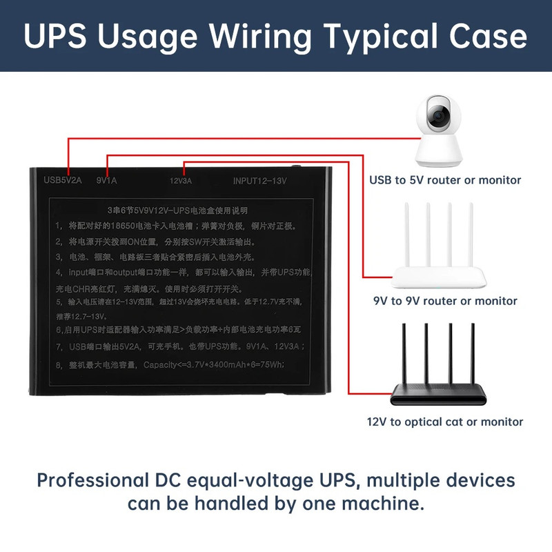 مینی یو پی اس Mini UPS 5-9-12 ، وسیله ای بسیار کاربردی می باشد که با دارا بودن خروجی های مختلف می تواند در زمان قطعی برق، همزمان چندین وسیله حساس مورد نیاز از قبیل مودم ، روتر ، کارتخوان ، دوربین مدار بسته و .... را تا مدت زمان قابل قبولی روشن نگه داشته و از خسارات ناشی از قطع برق بکاهد . این مینی یو پی اس دارای 3 خروجی مستقل می باشد : 12 ولت 3 آمپر ( فیش آداپتوری استاندارد 2.1*5.5 ) ، 9 ولت 1 آمپر ( فیش آداپتوری استاندارد 2.1*5.5 ) ، 5 ولت 2 آمپر ( فیش USB ) که می تواند برق طیف وسیعی از دستگاه های برقی مورد نظر را تامین کند . این مینی یو پی اس، بدون باتری عرضه می شود و کاربر متناسب با مقدار نیاز باید 6 عدد باتری لیتیون یونی 18650 سرتخت با ظرفیت مدنظر ( حداکثر 3400 mAh ) را جداگانه تهیه نماید . یک عدد کابل دو سر آداپتوری در بسته بندی دستگاه موجود می باشد و در صورت نیاز به تعداد بیشتر یا نیاز به فیش تبدیل متناسب با ورودی دستگاه ها ، باید جداگانه تهیه شود .